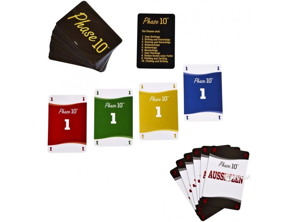 Hra Phase 10 obsahuje: 2 prehľadové karty, 24 červených kariet (2 x 1-12), 24 modrých kariet (2 x 1-12), 24 žltých kariet (2 x 1-12), 24 zelených kariet (2 x 1- 12), 4 preskakovacie karty, 8 divokých kariet (2 x 4 farby)