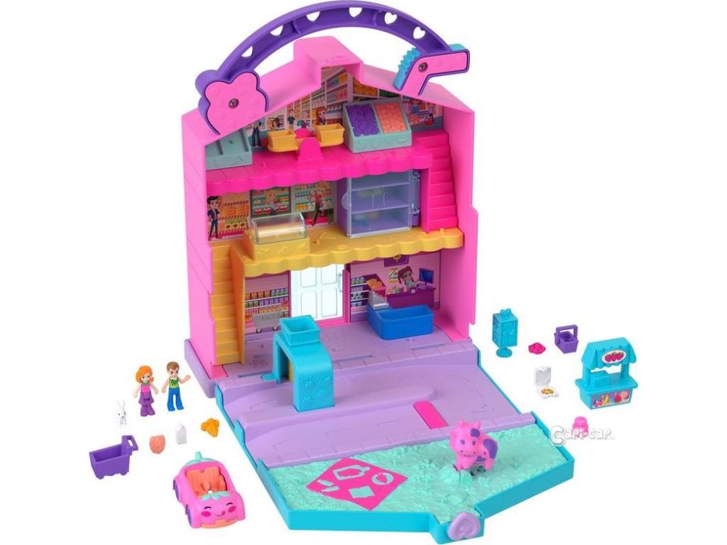 Je čas na zábavu při nakupování v Pollyville Fresh Market! Tato herní sada obsahuje 2 mikropanenky a 12 doplňků, včetně auta a zajíčka!