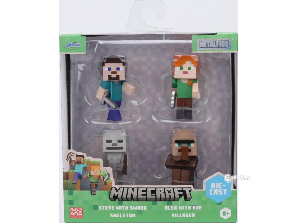 Sada kovových sběratelských figurek Minecraft, výška 6 cm. Steve s mečem, Alex se sekerou, Skeleton, Villager.