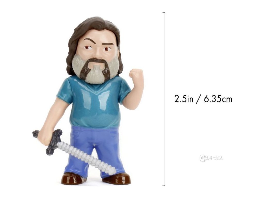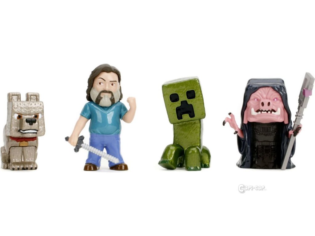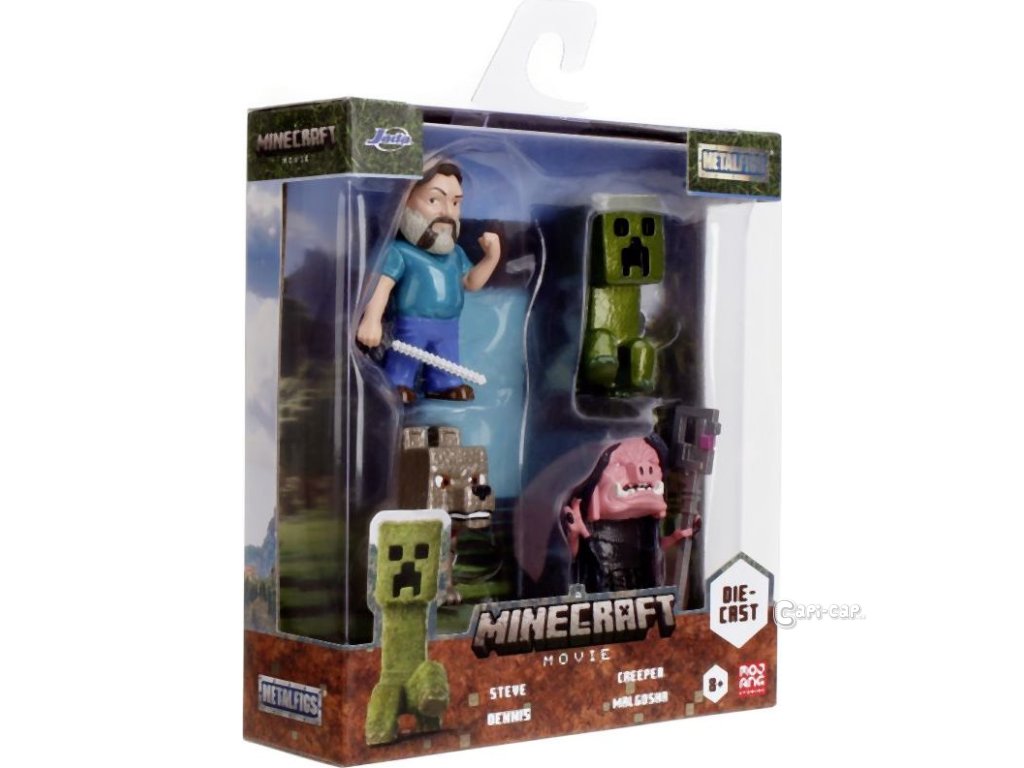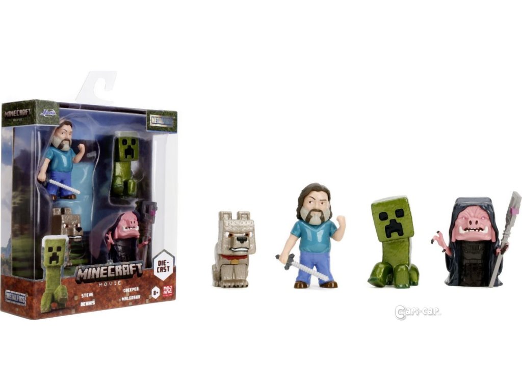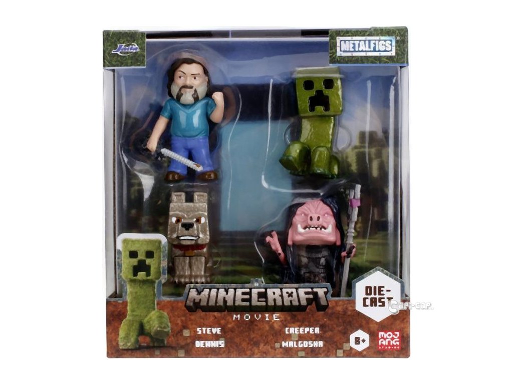 Sada 4 kovových figurek Minecraft Movie o velikosti cca 6,5 cm. Postavy: Steve, Wolf, Creeper, Malgosha.