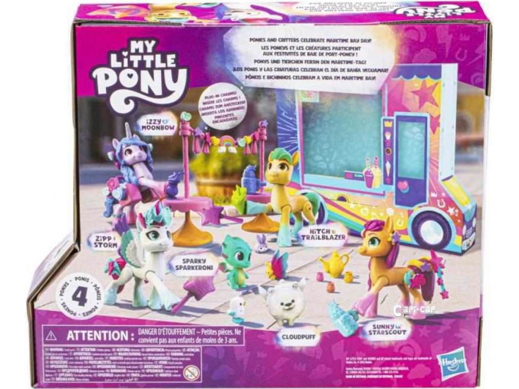 Oslávte s poníkmi a ich zvieracími kamarátmi deň v Maretime Bay! Tento set čerpá inšpiráciu zo špeciálu Deň v Maretime Bay v zábavnom programe pre deti. V cene je päť postavičiek poníkov zaujímajúcich rôzne pózy, ktoré sú veľké 8 cm. Chýbať samozrejme nesmú figúrky maznáčikov vrátane draka Sparkyho! Viac ako 40 doplnkov, stolík na menšie doplnky a prívesky, ktoré môžete vložiť do poníka, a vytvoriť si tak vlastný Cutie mark.