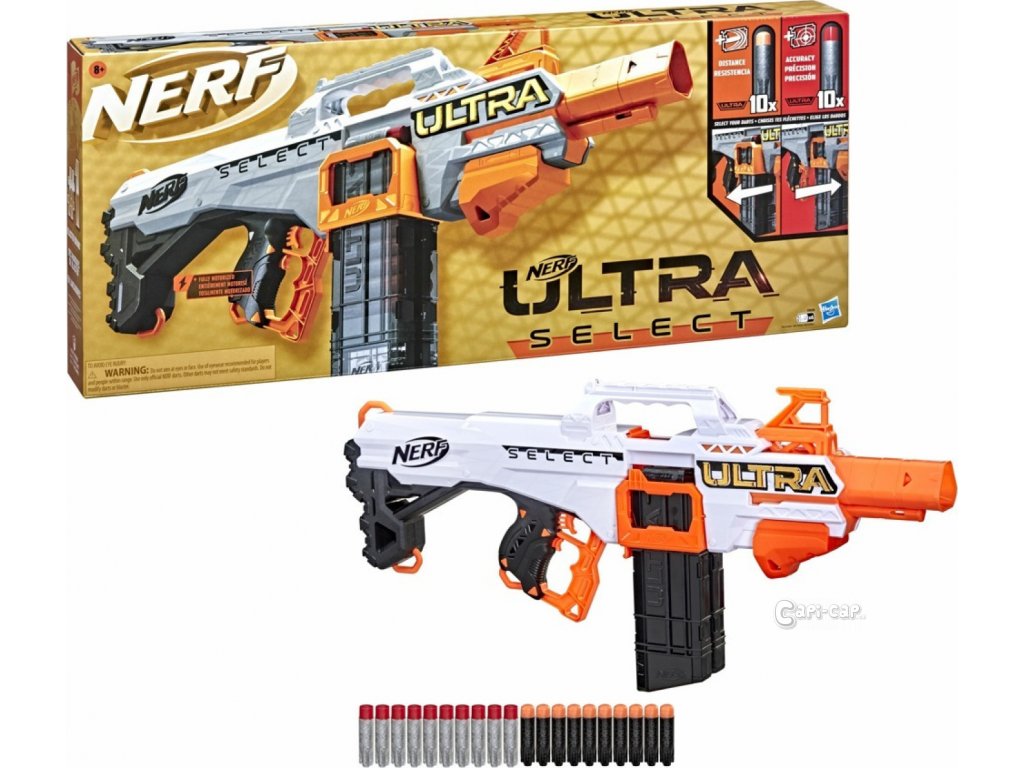 S blástrem Ultra select si doslova vyberete, jak chcete bojovat, a to uprostřed samotného boje! Úplně poprvé jsme zde použili možnost přepínače zásobníků, díky čemuž mají děti možnost přepínat mezi zásobníky uprostřed střelby. Tento automatický blástr je vybaven 2 odnímatelnými zásobníky na 10 šípek. Přepínač zásobníků mezi nimi umožňuje vybírat. Zvolíte-li tento blástr, setkáte se nejen s originálními Ultra šipkami, ale také se zbrusu novými šipkami Accustrike Ultra. Zvolte si, jaké šipky chcete používat. Závisí to na tom, jestli se chcete zaměřit na střelbu na velkou vzdálenost, nebo na přesnost. Ultra select je prvním plně automatickým ultra blástrem! Dodává se s 10 novými šipkami Accustrike Ultra a 10 Ultra šipkami pro střelbu na velkou vzdálenost.
