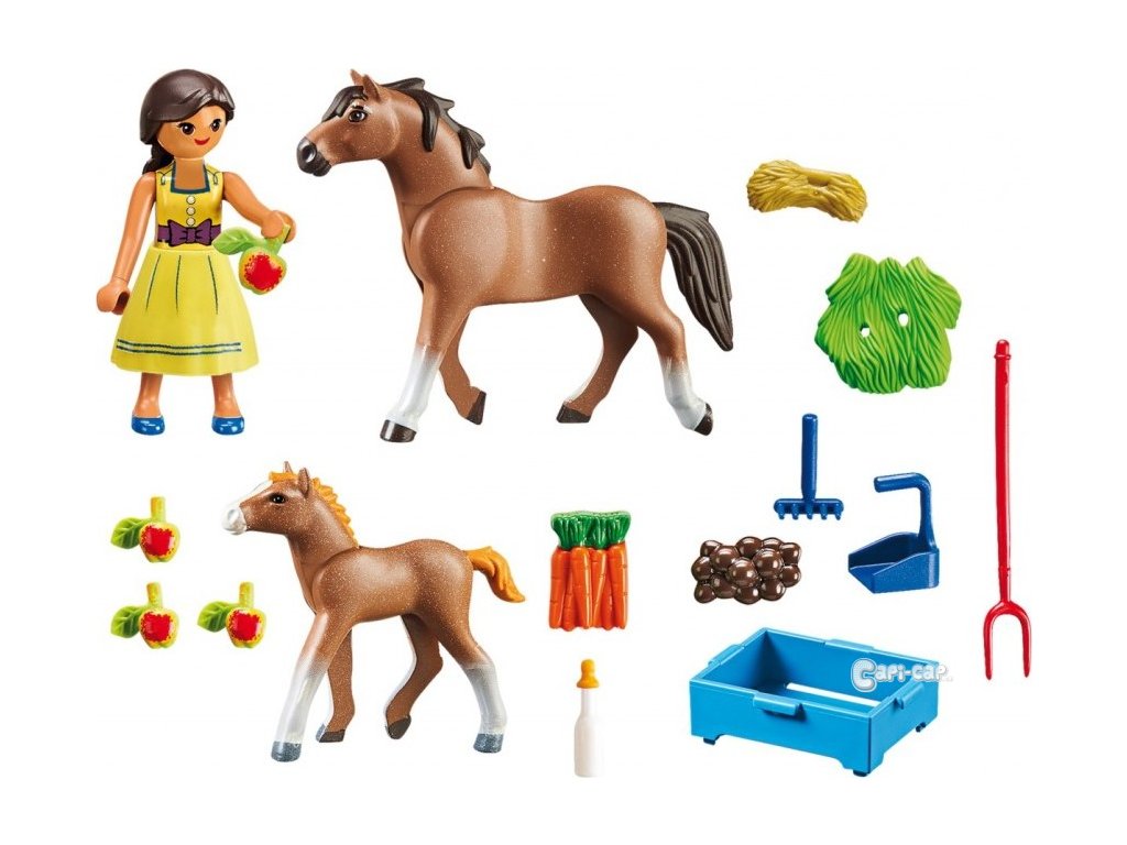 Obsahuje 1 figúrku dievčaťa, koňa, žriebä a množstvo doplnkov pre starostlivosť o kone.