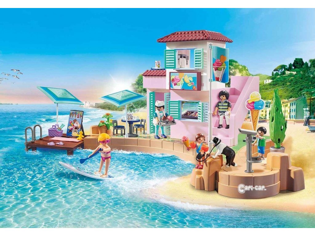 Set obsahuje poschodovú budovu zmrlinárne s posedením na hornom poschodí, mólo, stacionárny ďalekohľad, figúrky zmrzlinára, otca, mamy, dcédre, syna a psa border kóliu. Navyše je v sete veľmi bohaté príslušenstvo ako sú stolíky, stoličky, paddleboard, slnečník, zmrzlinársky pult, kornúty a poháre so zmrlinou a množstvo ďalšieho príslušenstva.