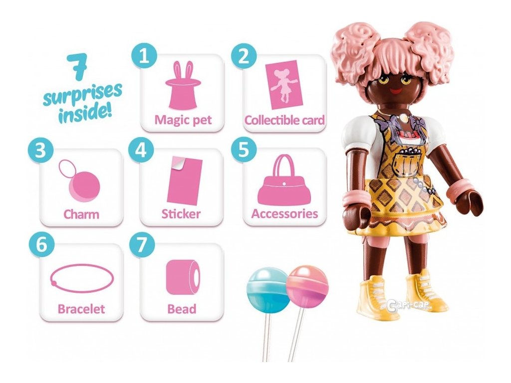 Obsahuje silikónový náramok, šperky, korálky, vaflové kúzlo, obchodnú kartu, nálepky a množstvo doplnkov.