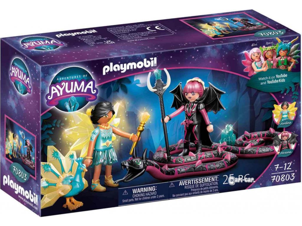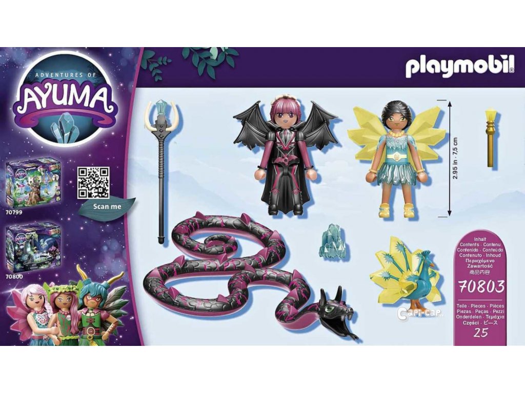 Očarujúce krištáľové víly žijú spoločne so svojimi vernými dušami v pokoji a mieri v idylickom rozprávkovom lese. Duše zvierat a víly sú spojené veľmi zvláštnym putom. Ale temné Bat Fairies sa snažia nájsť mystický zdroj energie a ukradnúť ich kryštál. Pritom vystavili svet víl veľkému nebezpečenstvu! Jedna zo zlovestných netopierích víl práve zistila, kde je magický zdroj energie. Vymrští sa do vzduchu svojimi netopierími krídlami, aby o svojom náleze povedala svojim priateľom. Dokáže ich statočná krištáľová víla a jej kúzelný krištáľový páv zastaviť včas? Na nápadité deti čakajú kúzelné rozprávkové dobrodružstvá. Sada hračiek obsahuje Krištáľovú vílu s krištáľovým pávom, Netopieriu vílu s hadmi, víli palicu a mnoho ďalších doplnkov. Playmobil sú stavebnice pre deti rôznych vekových kategórií, ktoré sú tematicky zamerané a majú mnoho prepracovaných doplnkov. Dieliky sú hygienické, ľahko umývateľné a nepúšťajú farbu. Stavebnice Playmobil podnecujú fantáziu, kreativitu a podporujú detský vývoj.