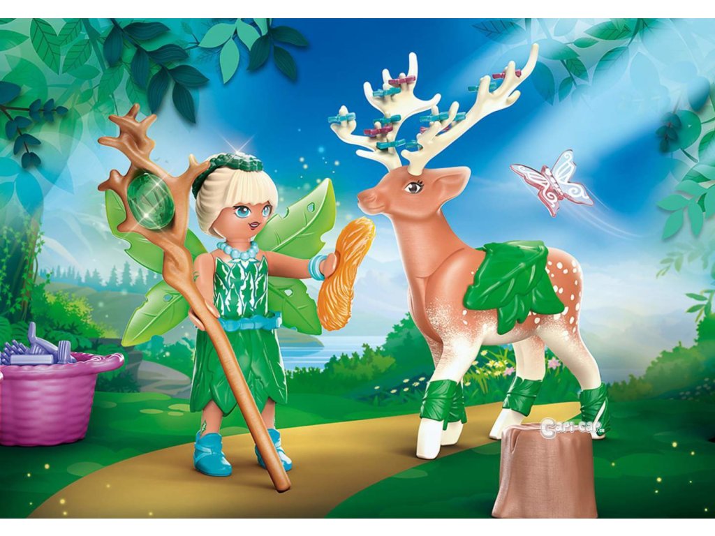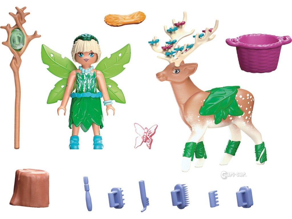 V kúzelnom rozprávkovom lese žijú kúzelné víly a ich duše v harmónii. Lesná víla má po svojom boku veľmi zvláštneho jeleňa ako zviera duše. Nielen víla, ale aj krásny motýľ tohto jeleňa miluje as radosťou sadá na svoje hrdé parohy. Niet divu, veď víla ozdobila parožou mnohými kvetmi. Pokiaľ je jej miláčik zranený, Lesná víla mu dodá obväzy a dá mu zjesť čerstvé seno. Vďaka ich starostlivosti a magickým schopnostiam víl sa váš spoločník behom chvíľky opäť uzdraví. Sada hračiek obsahuje Lesnú vílu s jeleňom, motýľom, kvietkami na prichytenie, košík s ošetrovacími doplnkami a mnoho ďalších kúzelných doplnkov. Listovú sukňu, opasok a náramky možno zložiť. Playmobil sú stavebnice pre deti rôznych vekových kategórií, ktoré sú tematicky zamerané a majú mnoho prepracovaných doplnkov. Dieliky sú hygienické, ľahko umývateľné a nepúšťajú farbu. Stavebnice Playmobil podnecujú fantáziu, kreativitu a podporujú detský vývoj.