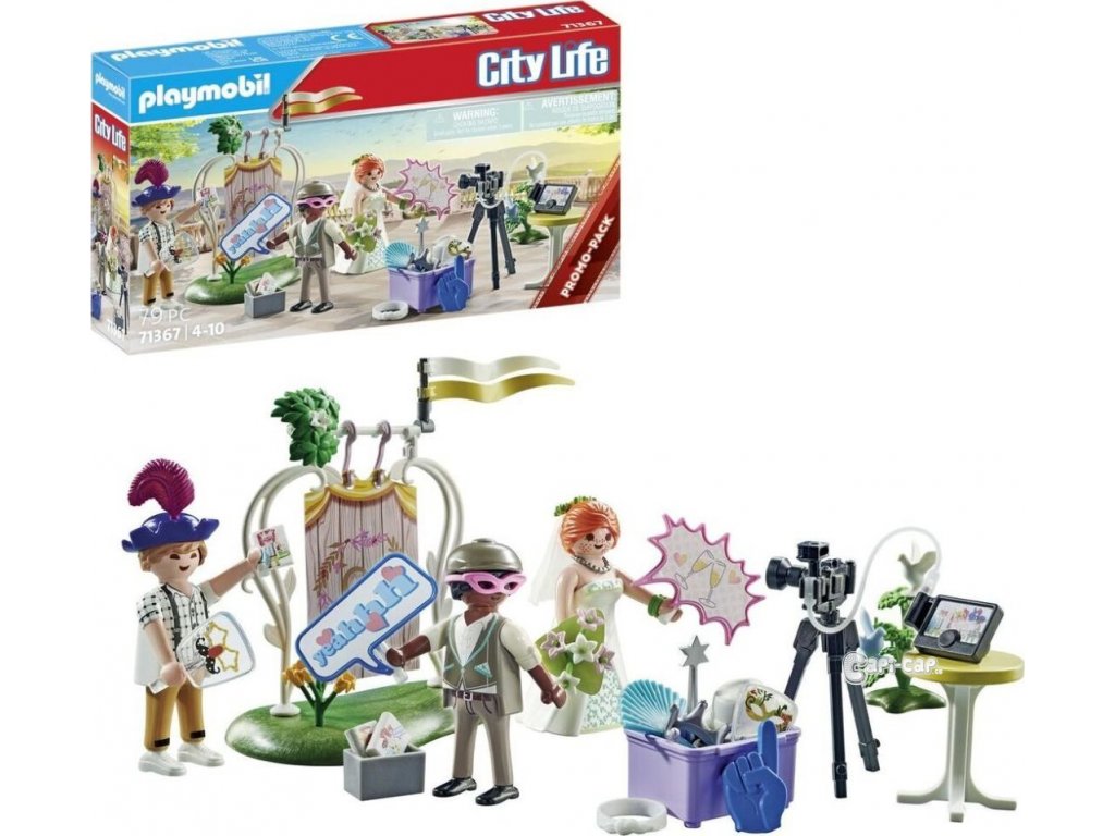 Sada hraček obsahuje tři figurky PLAYMOBIL, fotografické plátno, fotoaparát se stativem, vysoký stolek, monitor a mnoho doplňků, které lze obléknout pro zábavné fotografie na památku.