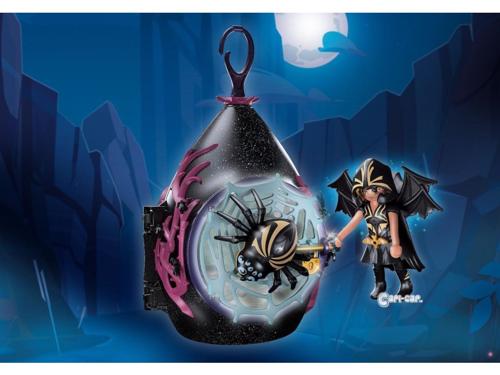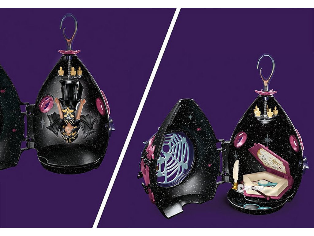 Prístrešok Netopierie víly možno zavesiť na zrúcaninu Netopierie víly alebo v detskej izbe pomocou háčika. Možno ho tiež ozdobiť trblietavými hviezdičkami. Vrátane tajnej priehradky! Brloh Netopierích víl ponúka desivo útulný domov. Tu si Netopieria víla uchováva svoje ukradnuté kryštály. Práve znova ukoristila niekoľko cenných kameňov a uložila ich do veľkej knihy do úschovy. Potom sedí vo svojom úkryte a študuje čarovný pergamen. Kde by sa mohlo skrývať viacero kryštálov? Pred spaním sa Netopieria víla chúli hlavou dolu pri lustra svojej chalúpky, zatiaľ čo jej milované duchovné zviera, obrí pavúk, stráži vonku pri pavučinových dverách. S takým strážcom by sa nikto neodvážil ukradnúť kryštály. Sada obsahuje Netopieriu vílu so zvieratkom pavúčieho ducha, domček so slzami, tri malé kryštály, brko, kalamár, kefu na vlasy, pláštenku Netopierie víly, pár krídiel a mnoho ďalších doplnkov pre kúzelné rozprávkové dobrodružstvá. Prístrešok Netopierie víly možno zavesiť na zrúcaninu Netopierie víly alebo v detskej izbe pomocou háčika. Objavte nový zážitok z montáže: Vďaka očíslovaným taškám začína zábava hneď po vybalení!