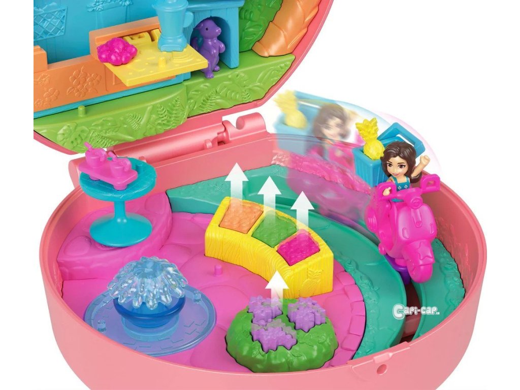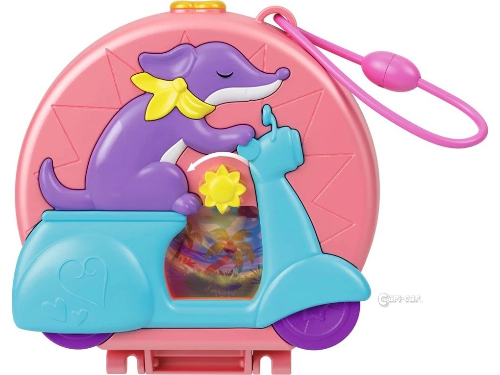 Tento rozkošný Polly Pocket kufřík má exteriér mopedu pro štěně se zábavnými nemotornými koly.