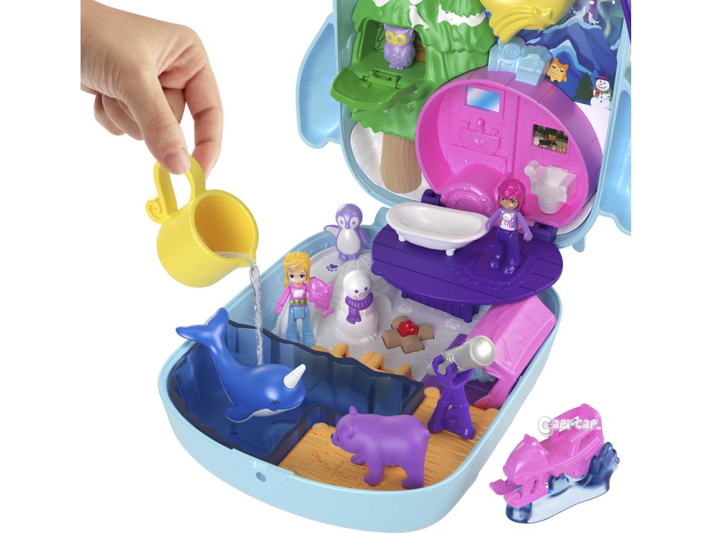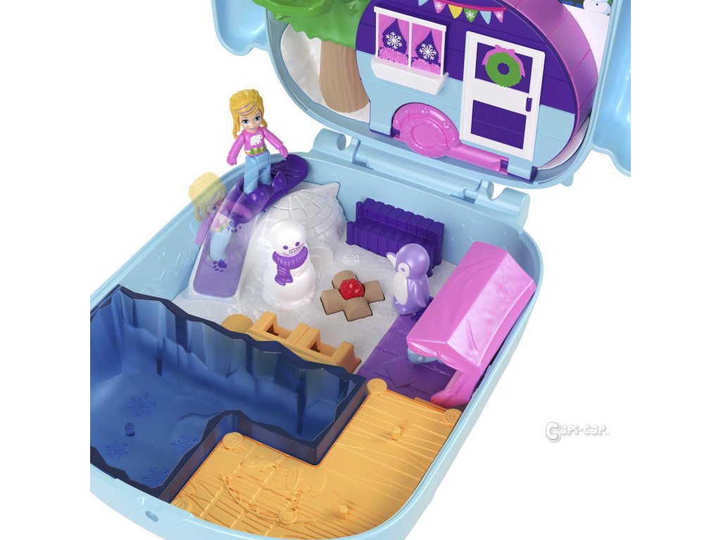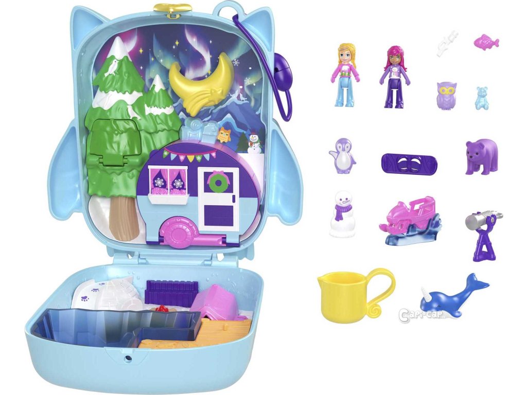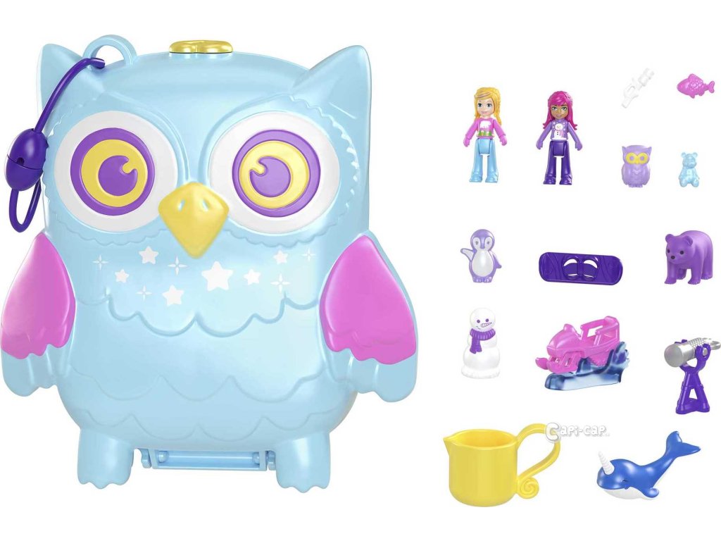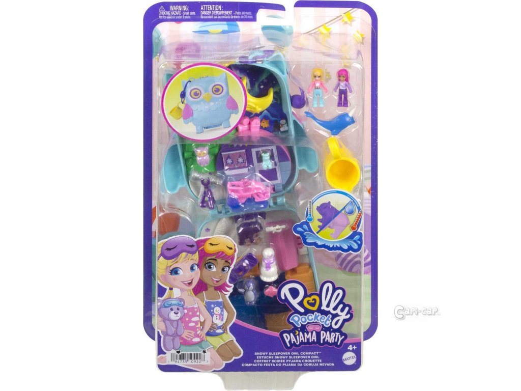 Tento Polly Pocket Pyžamová párty Snowy Sleepover Owl Compact se otevírá do chladného iglú pyžamové párty s mikro panenkou Polly a jejím kamarádem, navíc se zvířecími kamarády, jako je sněžná sova, narval a další!