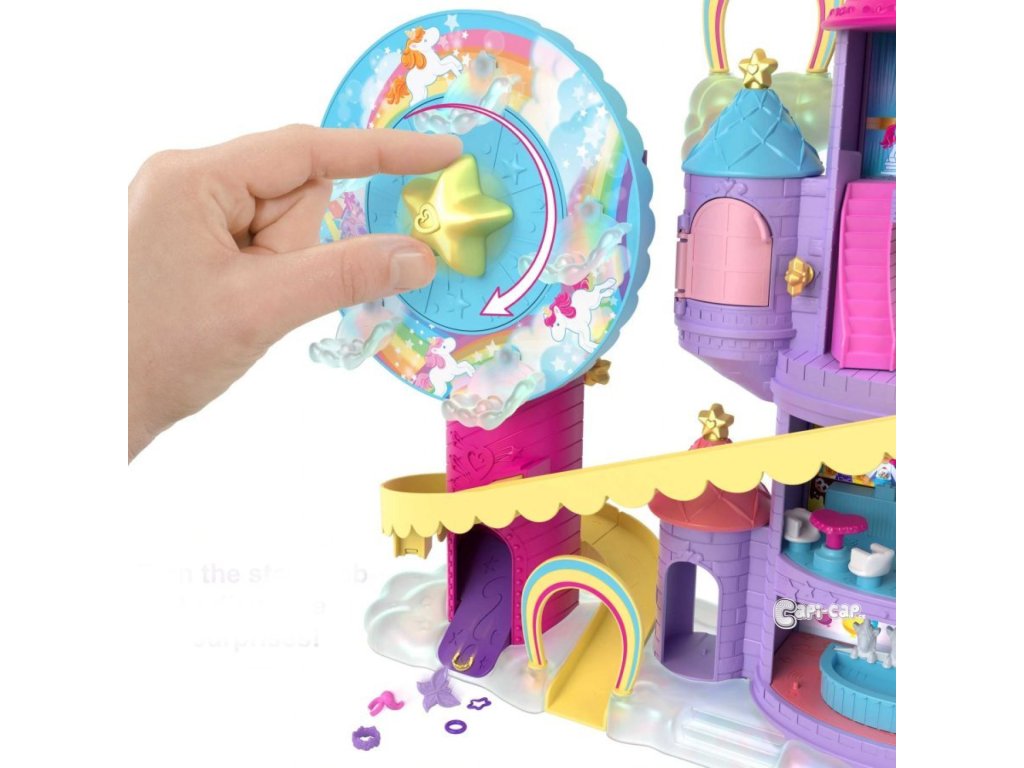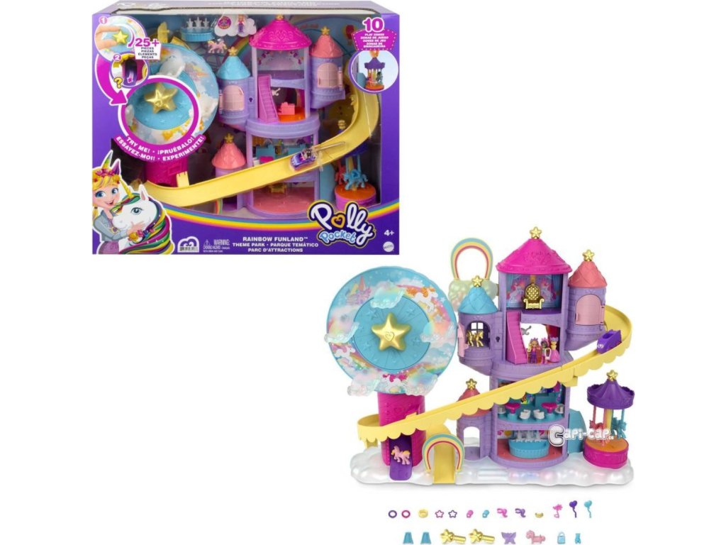 The Rainbow Funland™ Theme Park je úžasná herní sada, která obsahuje 3 atrakce, 7 herních oblastí, panenky micro Polly™ a Shani™, 2 jednorožce a 25 překvapení (celkem 30 herních figurek).