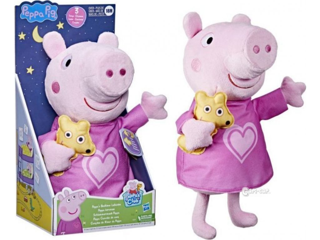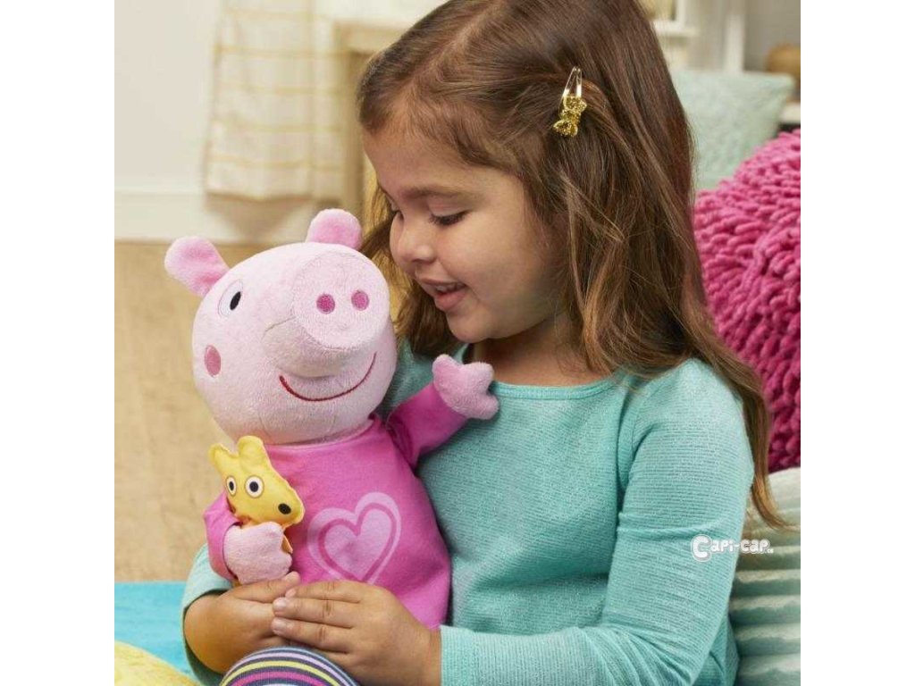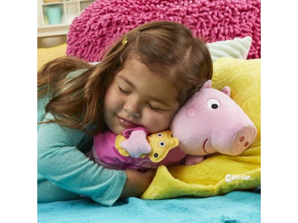 Plyšové prasiatko Peppa vo veľkosti 28 cm oblečené do svojho ikonického ružového pyžamá s plyšákom v ruke vám zaspieva tri rôzne uspávanky a pobaví radom hlášok. Dokonca sa aj chichotá a mňauká.! Budete potrebovať tri gombíkové batérie, ktoré sú súčasťou balenia.