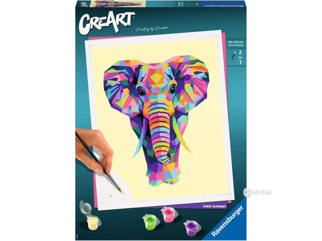 CreArt - to je kreativní zábava doslova pro každého. Staňte se na chvíli profesionálním malířem a namalujte si svůj vlastní obraz. Tento vtipný slon ozdobí každou zeď. Postupně vybarvujte jednotlivé plochy podle návodu (každé číslo na plátně odpovídá jedné konkrétní barvě) a dopřejte si radost z tvůrčí práce, u které se zabavíte na dlouhé hodiny. Malování je skvělá činnost, která nejen baví, ale také procvičuje zručnost, zlepšuje koncentraci a zaručuje spokojenost a pocit hrdosti všem umělcům. Set obsahuje vše, co potřebujete k malování: vysoce kvalitní, pevné plátno s obrazovou předlohou s očíslovanými plochami, sadu akrylových barev, štětec, kartonový stojánek pro kelímky s barvami a rámeček. Vykreslené plochy vytváří profesionálně vypadající umělecké dílo. Jakmile obraz dokončíte, nechte ho zaschnout a zarámujte ho do rámečku, který je součástí balení. Malování nikdy nebylo tak jednoduché.