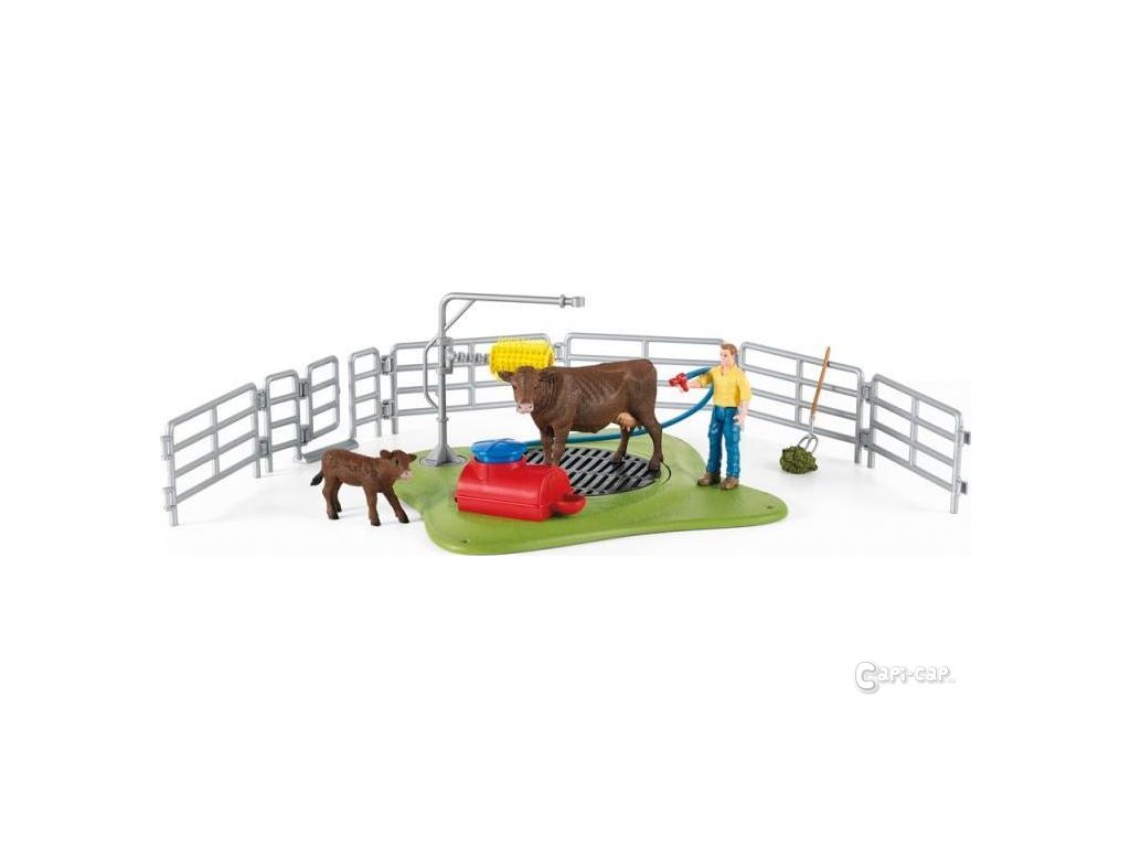 Dnes je čas na kúpanie! V novej umývacej stanici pre kravy zo Schleich® FARM WORLD je pekne rušno! Kravy prichádzajú z pastvy, a kým sa vrátia do stajne, musia sa umyť. Najmä malé teľa je veľmi napäté. Dnes je so svojou matkou prvýkrát na kúpalisku. Poľnohospodár Martin z FW zatlačil na pumpu a všetko sa môže rozbehnúť. To je ale zábava! Malé teľa stojí na točne a môže byť očistené zo všetkých strán. Poľnohospodár Martin kravy osprchuje, a potom im ešte dopraje masáž kefou. To je zážitok! Je možné naplniť vodou! Sada obsahuje: 1x poľnohospodár, 1x krava, 1x teliatko, 1x vidly, 1x seno, 5x vŕbový plot, 1x brána, 1x kefa na kravy, 1x úchytka na kefu na kravy, 1x tyč, 1x doska s otočným tanierom, pumpa s funkciou striekania. Figúrky Schleich sú mimoriadne detailné, láskyplne maľované a umožňujú deťom hrať sa a zároveň sa učiť. Nevhodné pre deti do 3 rokov. Rozmer balenia: 29 x 23 x 11 cm. Odporúčaný vek: 3-8 rokov.Buďte prvý, kto napíše príspevok k tejto položke.