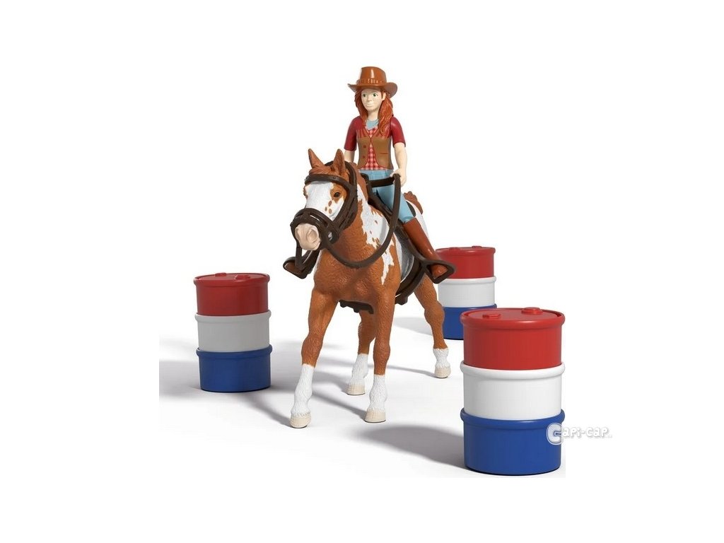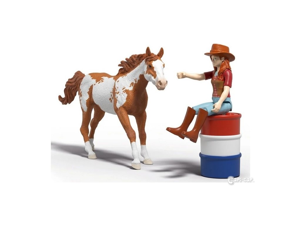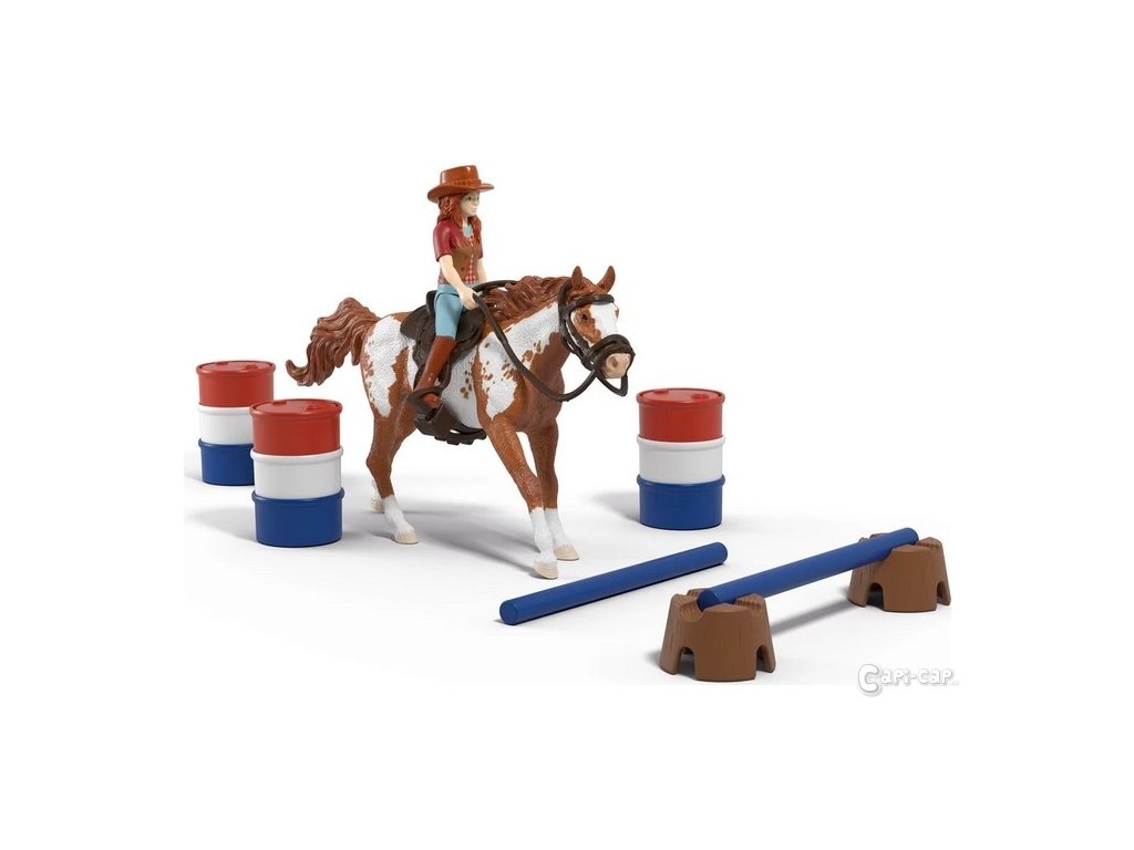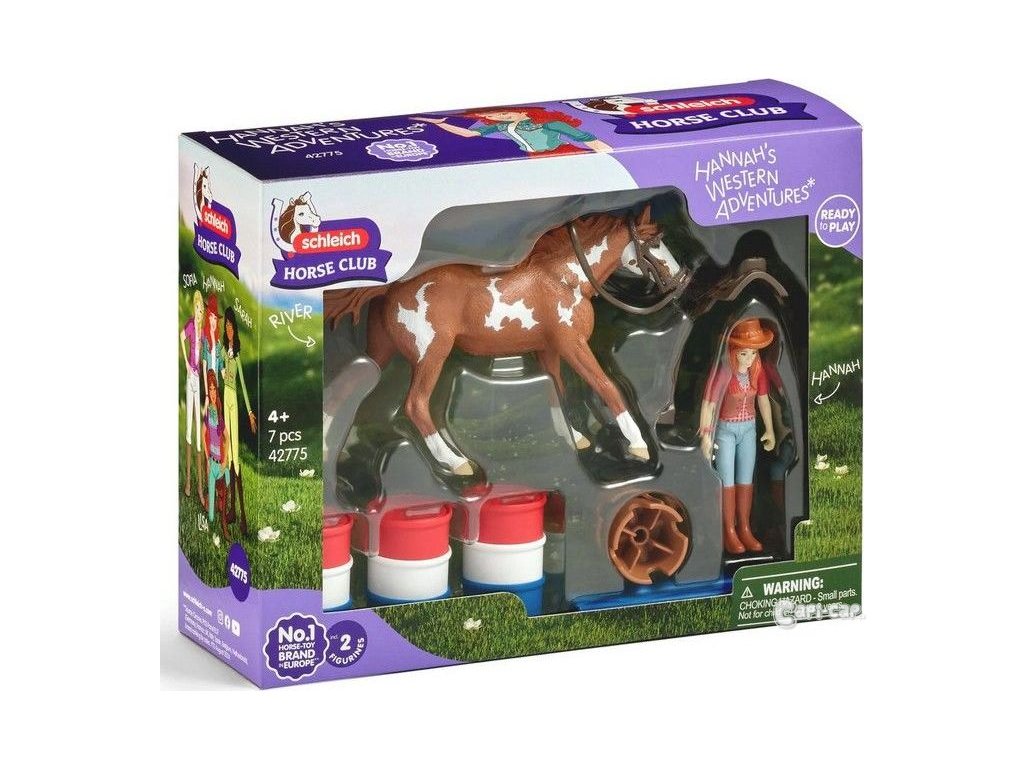 Konečně je to tady – Hannah westernové dobrodružství může začít. Hannah se rozhodla zúčastnit Barrel Racing se svým věrným valachem paint horse. Na tento turnaj usilovně trénovali. Na jezdeckém oválu jsou již postaveny tři sudy. Cíl: Se svým koněm chce tyto barely co nejrychleji objet v pevně daném pořadí. Před zahájením turnaje se Hannah se svým valachem paint horse chce trochu zahřát a nechá ho přeskočit několik překážek. Samozřejmě má na sobě kovbojský klobouk a sedí ve westernovém sedle. Ti dva vypadají skvěle, že? Obsah sady: 1x valach paint horse River, 1x figurka Hannah, 1x kovbojský klobouk, 1x červený náramek, 1x westernové sedlo, 1x uzda, 2x překážková tyč, 2x překážkový kmen stromu, 3x barelový díl modrý, 3x barelový díl červený, 3x barelový díl bílý. Sedlo a uzdu lze sejmout. Překážkové tyče lze použít k mnoha účelům. Sada Schleich® patří do tematického světa HORSE CLUB a je vhodná pro děti od 5 do 12 let. Rozměry balení: 19 x 24,5 x 8 cm. Nevhodné pro děti do 3 let. Věk: 5+