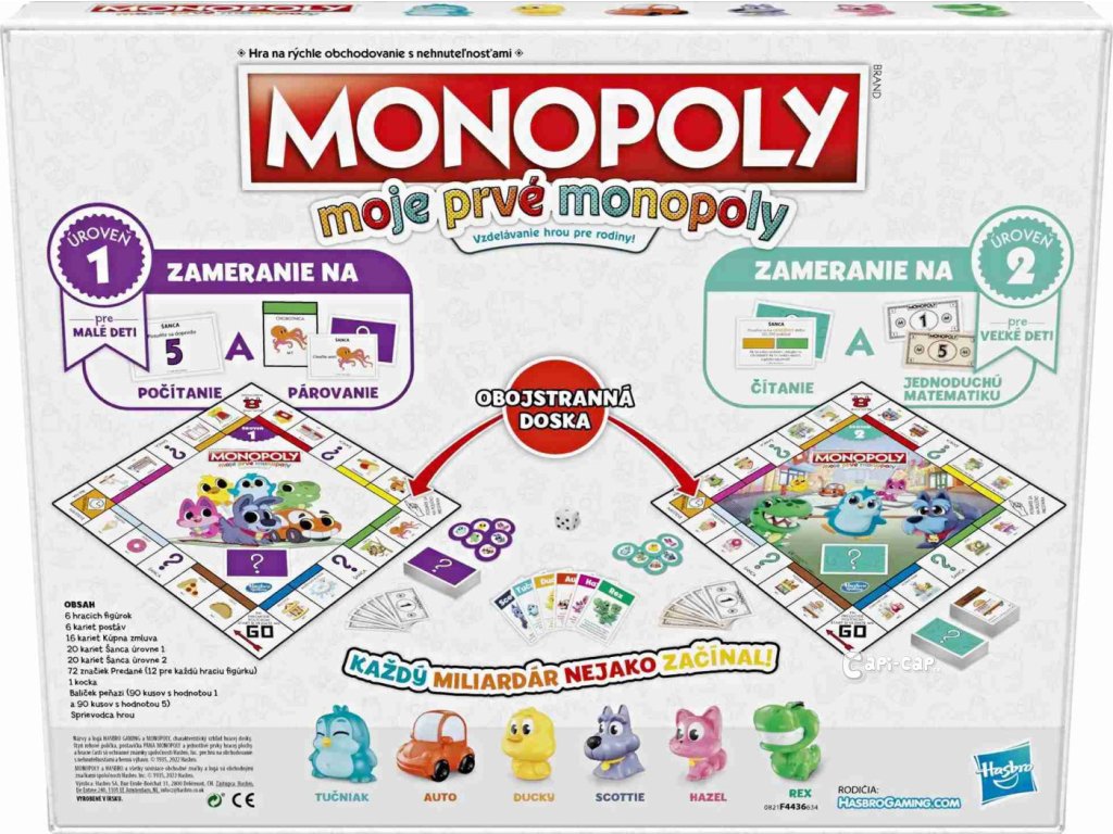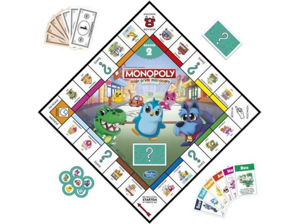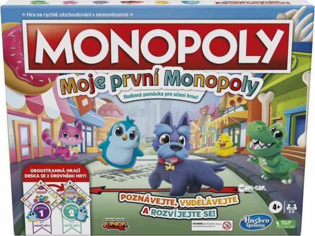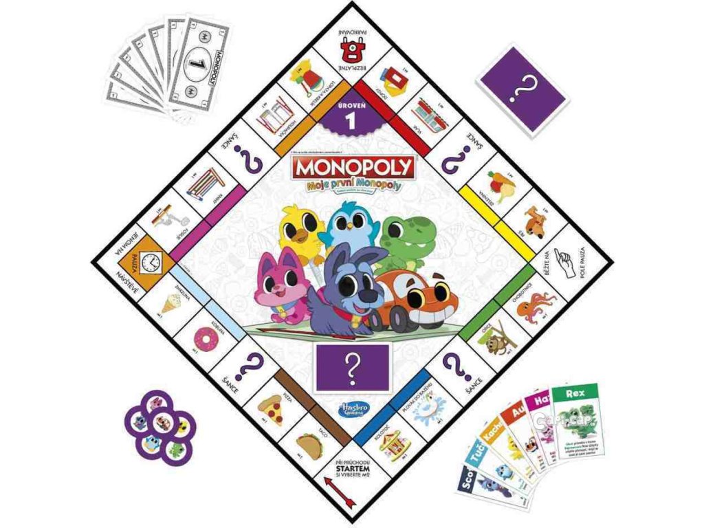 Tato nová verze obsahuje oboustrannou hrací desku pro 2 způsoby hry! Díky jednoduché hratelnosti a lokalitám vhodným pro děti je tato hra skvělým vstupem do hry Monopoly. Hra, která roste s vašimi dětmi! Jedna strana je určena pro mladší děti (4+), a když ji otočíte, najdete pokročilejší hru pro starší předškoláky! Hra obsahuje sadu karet pro každou úroveň. Mladší děti mohou hrát s dolarovými bankovkami a starší děti mohou použít balíček pětidolarovek. Hra obsahuje žetony inspirované klasikou a představuje 2 nové žetony.