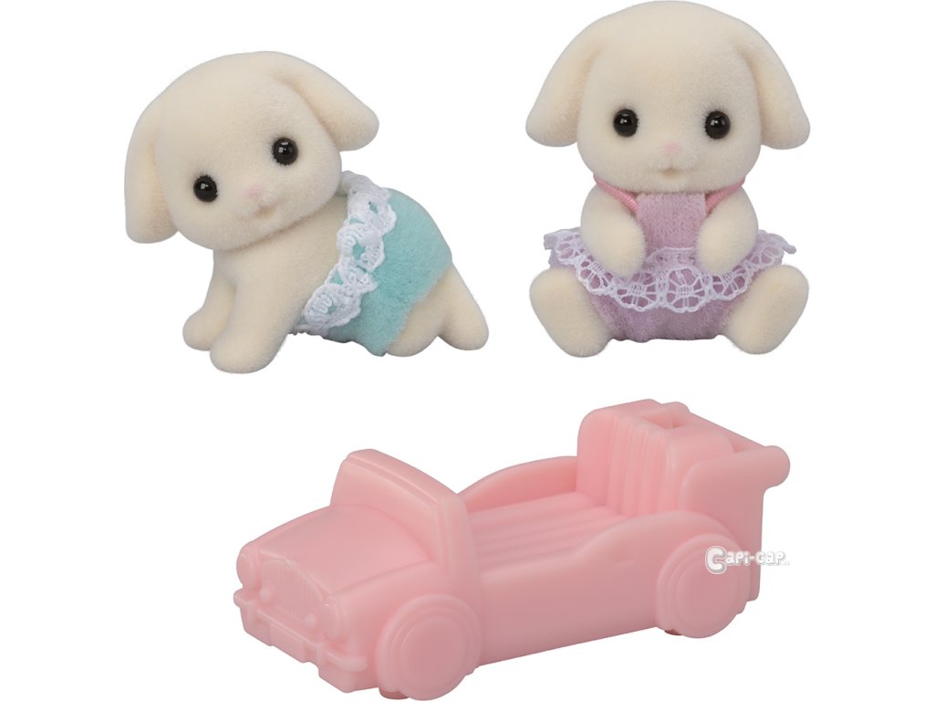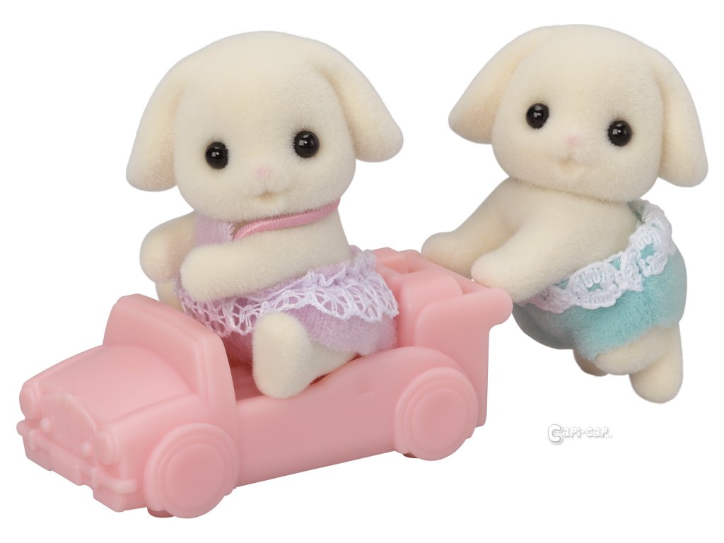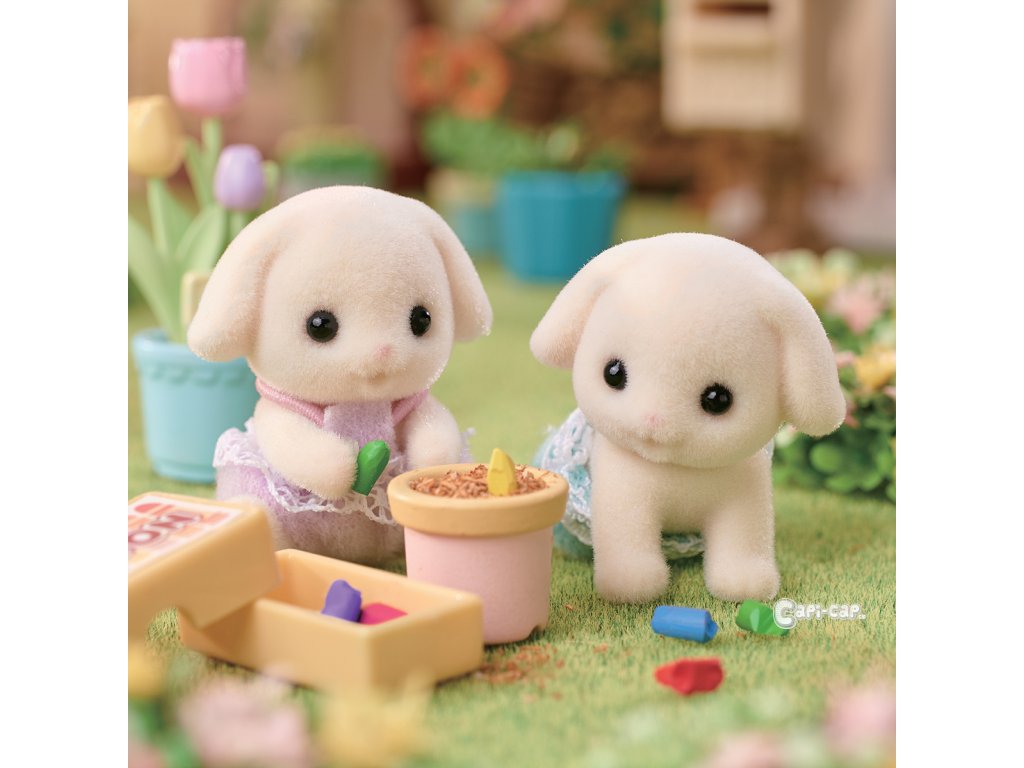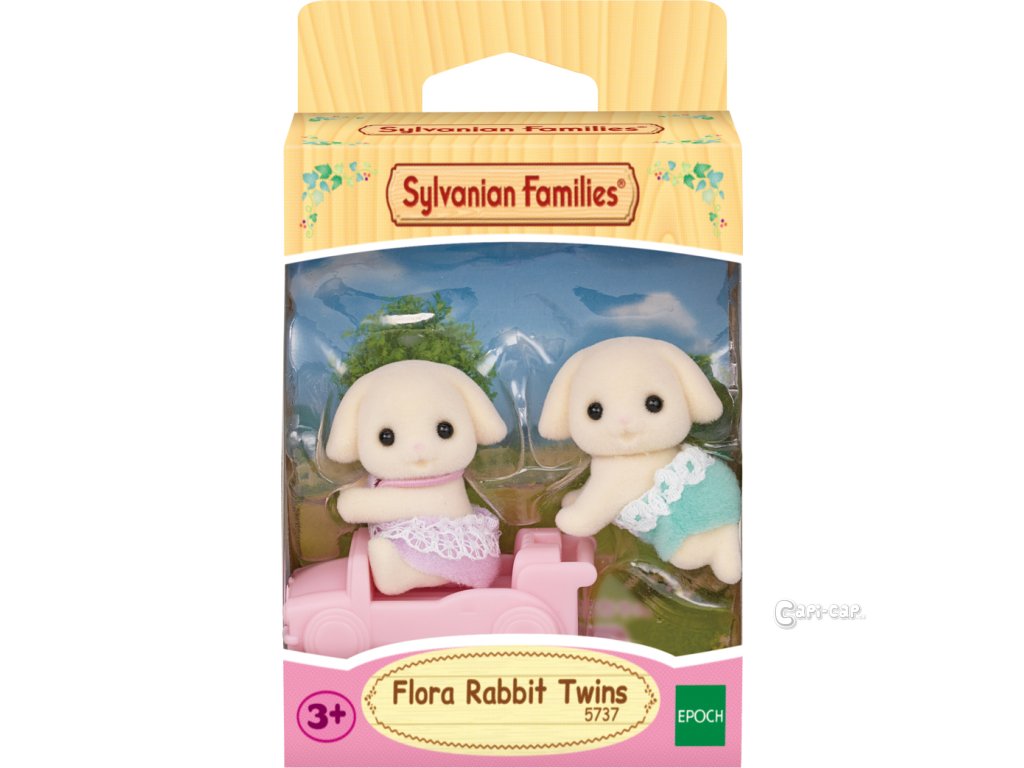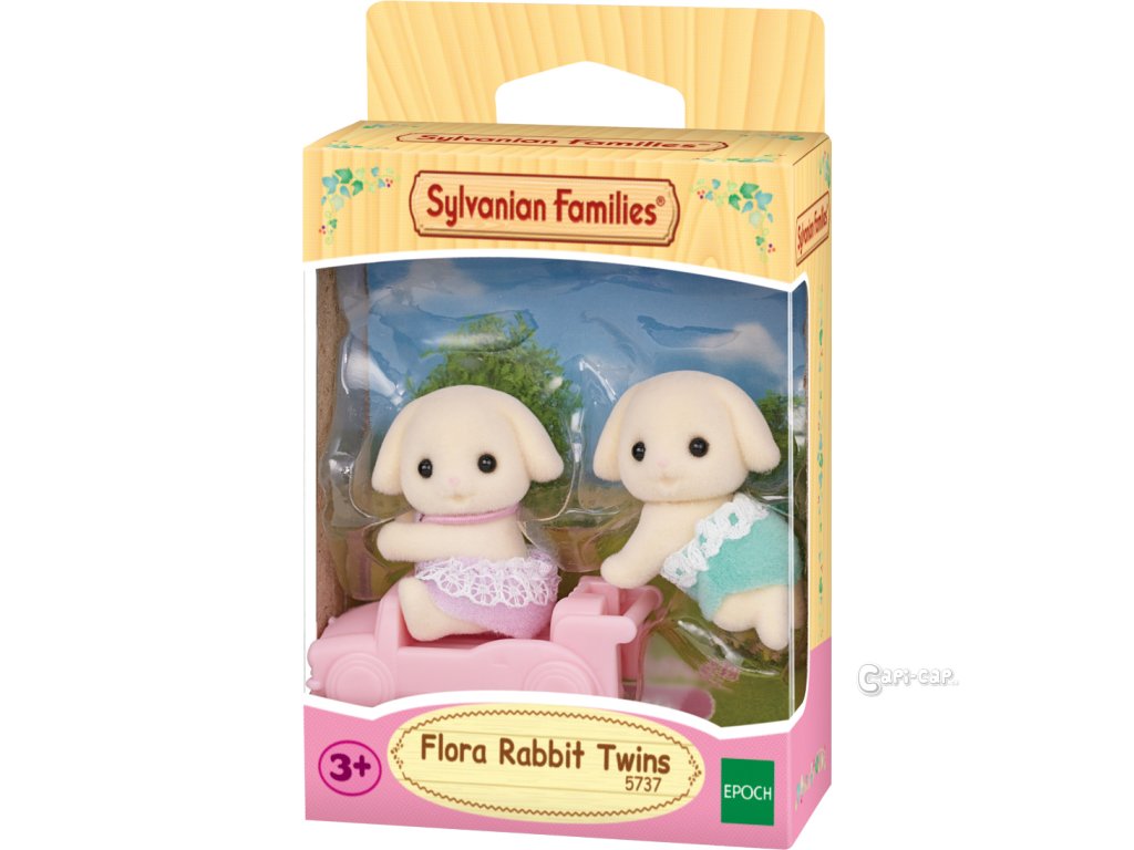 Sada dvojčata Flora Rabbit s roztomilýma svěšenýma ušima a vozíkem. Hlavy figurek lze otáčet. Obě dvojčata Flora Rabbit (sedící nebo lezoucí) umí jezdit na vozíčku. Rozměr balení: 75x120x35mm. Věk: 3+