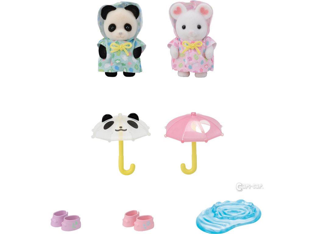 Tato dvě rozkošná miminka Sylvanian Families jsou perfektní duo pro deštivý den a rádi se cákají v kalužích! Procházky v deštivý den jsou pro přátele, miminko Pookie pandu Angelu a miminko Marshmallow myšku Alberta, oblečené do svých nových rozkošných pláštěnek s kapucí. Sada také obsahuje dva roztomilé malé deštníky, které perfektně padnou do tlapek dětí, dva páry gumových holínek a dokonce i loužičku na skákání! Věk: 3+