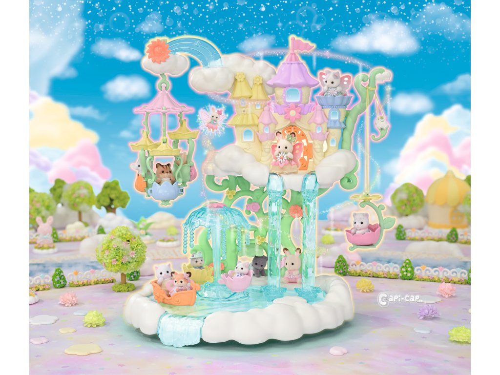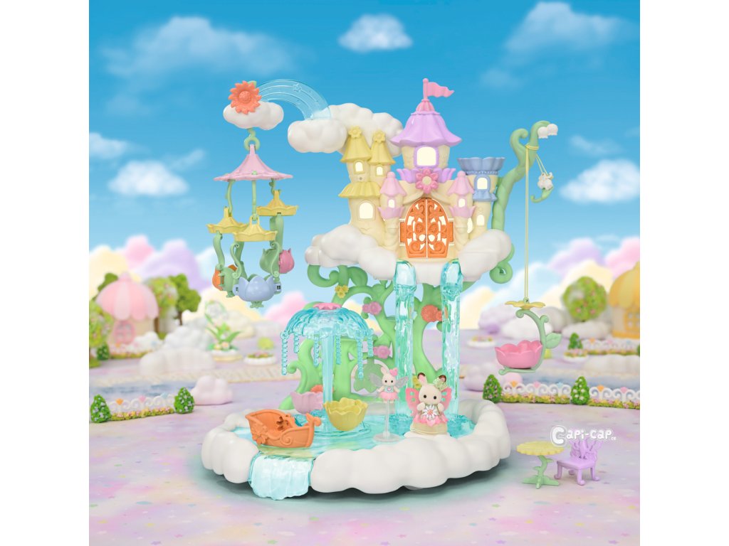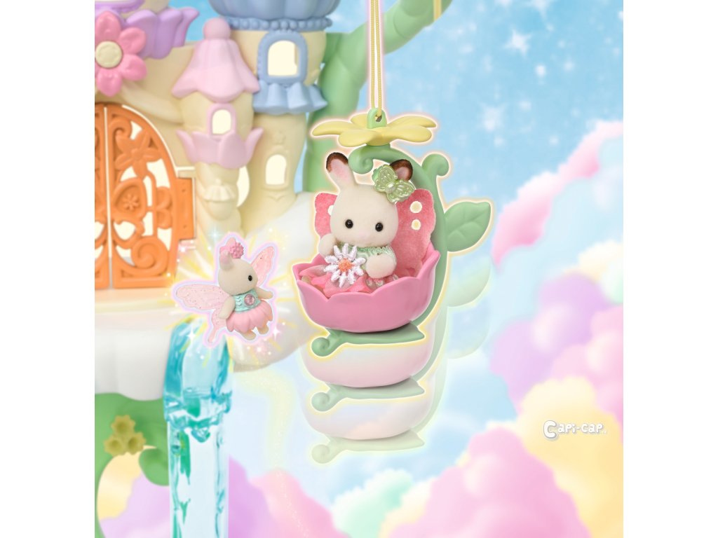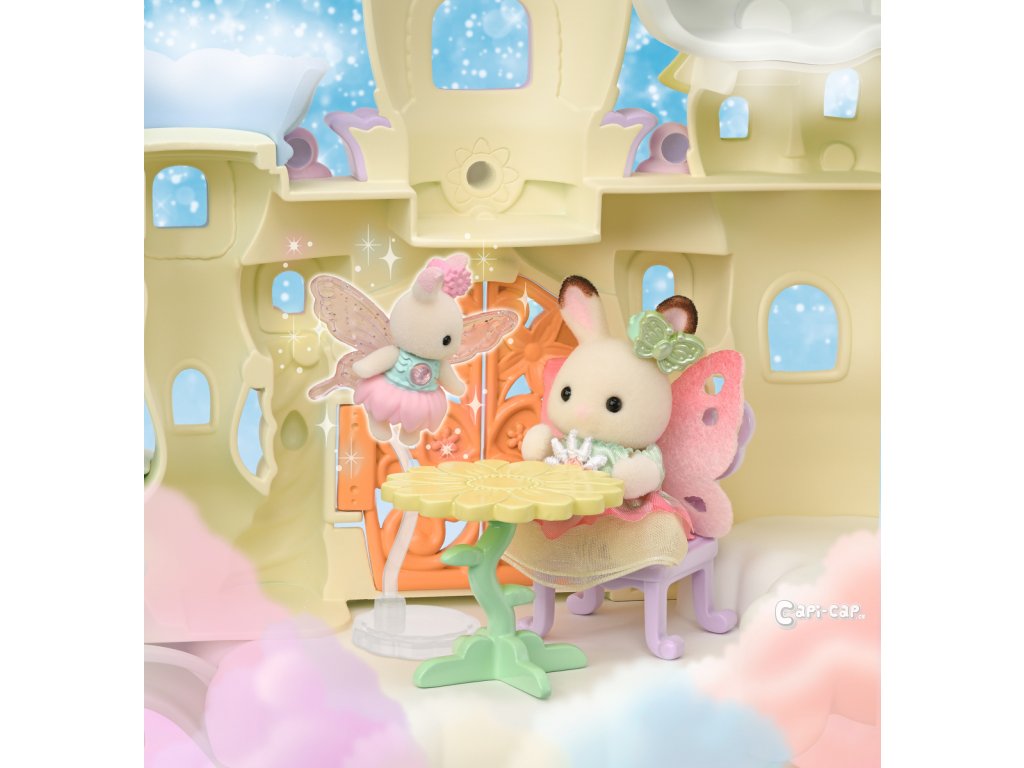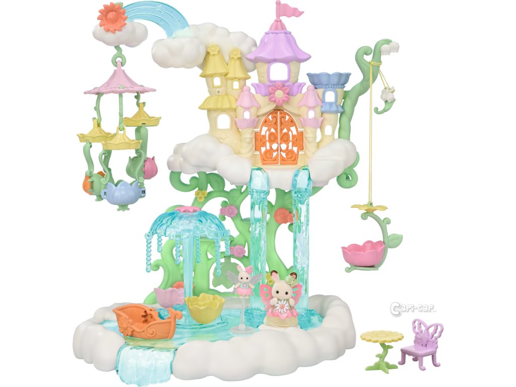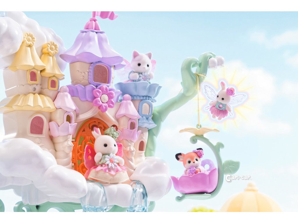 Vítejte v nebeském paláci květinových víl. Tento krásný set plný atrakcí přenese milovníky světa Sylvanian Families do magického světa úžasné zábavy. Nebeský palác je obklopen sněhově bílými mraky, ze kterých vycházejí křišťálově čisté vodopády. Modré pramínky tryskají bublinkami vody, vytvářející fontánu-kolotoč se dvěma sedadly ve tvaru květinových kalichů. Voda z pramene a vodopádů padá přímo do jezírka, na kterém pluje loďka s kouzelným držákem pro květinovou vílu. Květinová víla připevněná k držáku vypadá, jako by skutečně levitovala ve vzduchu. Malý ostrůvek z mraku je ideálním místem pro obdivování jezírka. Květinový výtah zaveze děti na vyhlídkovou terasu, odkud mají výhled na celé okolí. Nebeský kolotoč se třemi sedadly ve tvaru květinových kalichů je připevněn k mrakům, které se vznášejí nad palácem. V nebeském paláci květinových víl je spousta vzrušujících atrakcí, které si zamilují všechny baby zvířátka. Děti, které budou chtít odpočívat, si mohou sednout k malému stolku v útulné kavárně. Sada obsahuje dvě roztomilé figurky malou Creme z rodiny čokoládových králíků a figurku malého králíčka-květinové víly. Sadu lze kombinovat s dalšími sety z kolekce Květinové víly. Hračky Sylvanian Families rozvíjejí představivost a povzbuzují děti k hraní rolí. Hra s figurkami rozvíjí kreativitu a učí emocím vytvářením a vyprávěním příběhů založených na každodenních zážitcích a pozorování světa. Vyznačují se nejvyšší kvalitou a výjimečným důrazem na detaily. Figurky Sylvanian Families jsou pokryté měkkým semišem, mají pohyblivé končetiny a hlavu. Oblečení lze z figurek sundat a vyměnit za jiný outfit. Baleno v krabičce. Rozměry balení: 35 x 44 x 14 cm. Věk: 3+