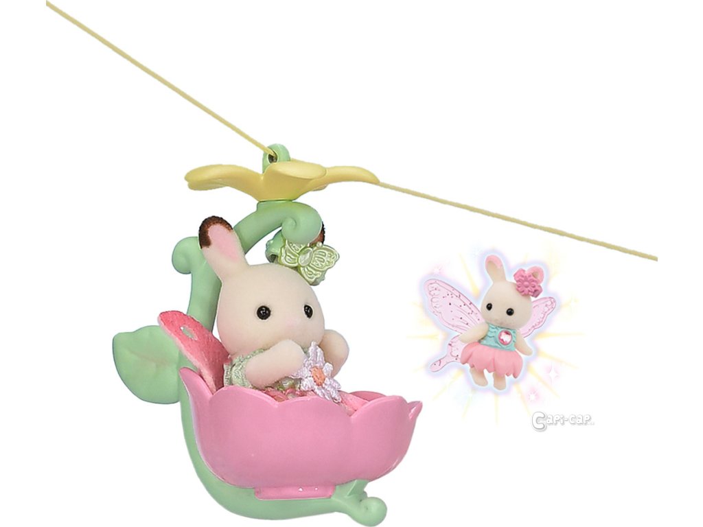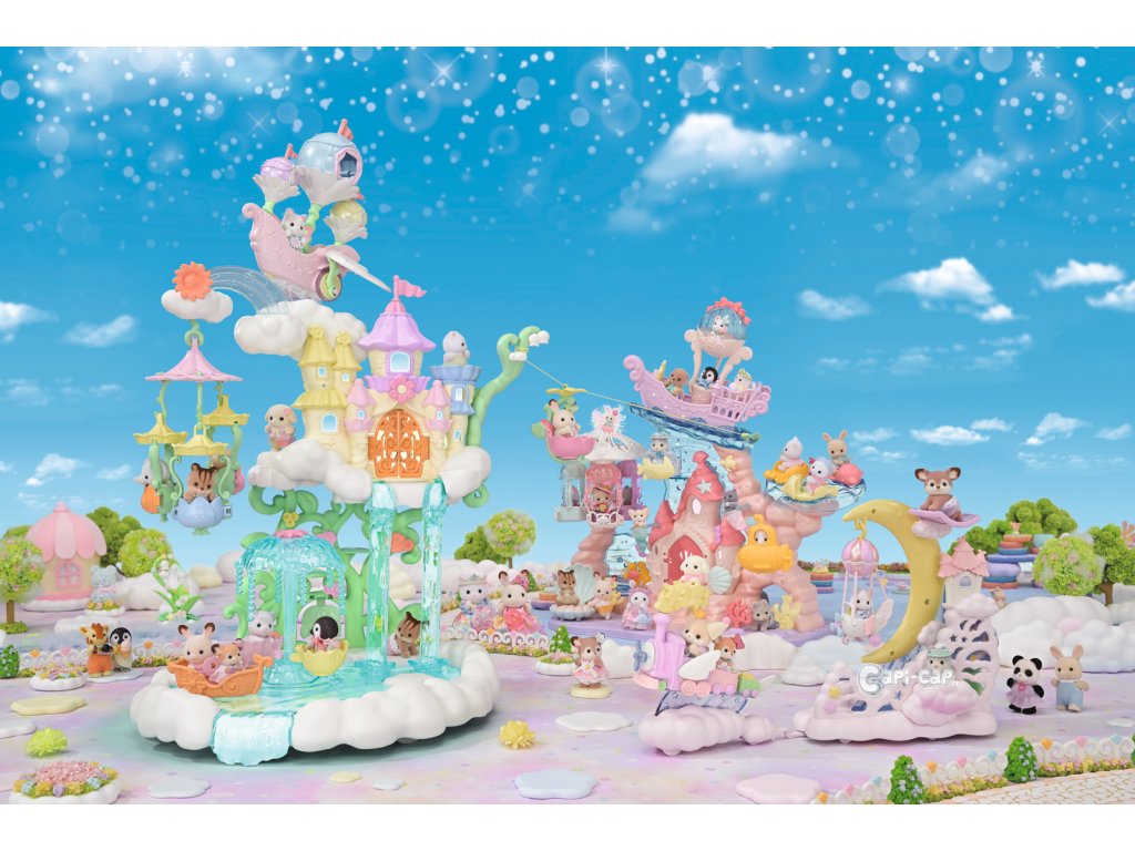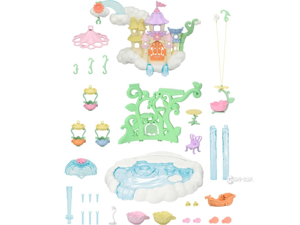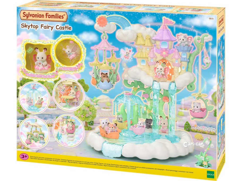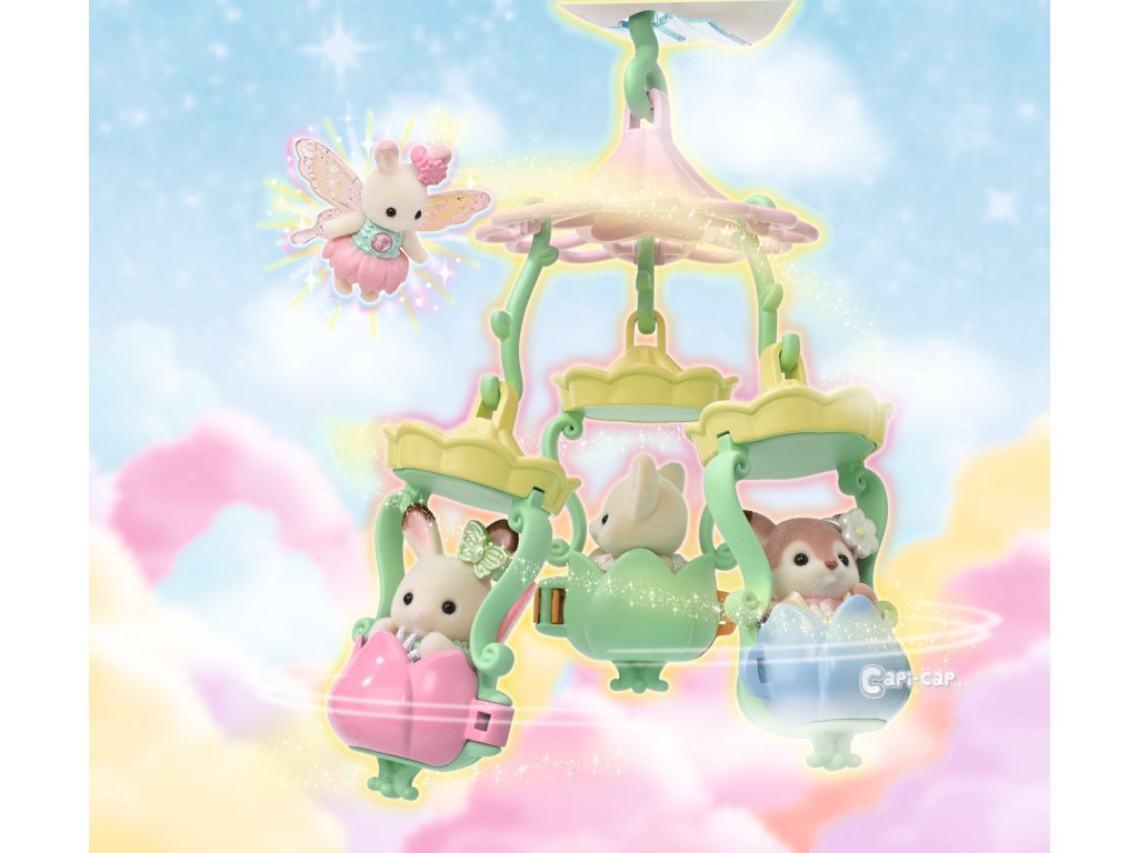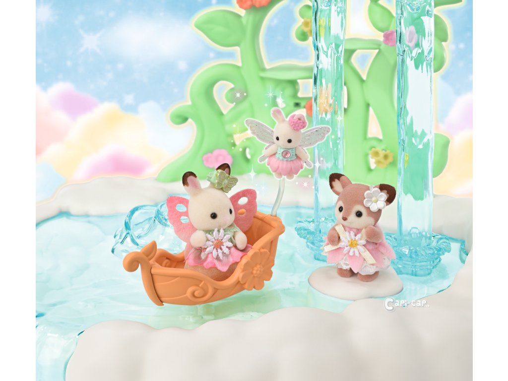 Vítejte v nebeském paláci květinových víl. Tento krásný set plný atrakcí přenese milovníky světa Sylvanian Families do magického světa úžasné zábavy. Nebeský palác je obklopen sněhově bílými mraky, ze kterých vycházejí křišťálově čisté vodopády. Modré pramínky tryskají bublinkami vody, vytvářející fontánu-kolotoč se dvěma sedadly ve tvaru květinových kalichů. Voda z pramene a vodopádů padá přímo do jezírka, na kterém pluje loďka s kouzelným držákem pro květinovou vílu. Květinová víla připevněná k držáku vypadá, jako by skutečně levitovala ve vzduchu. Malý ostrůvek z mraku je ideálním místem pro obdivování jezírka. Květinový výtah zaveze děti na vyhlídkovou terasu, odkud mají výhled na celé okolí. Nebeský kolotoč se třemi sedadly ve tvaru květinových kalichů je připevněn k mrakům, které se vznášejí nad palácem. V nebeském paláci květinových víl je spousta vzrušujících atrakcí, které si zamilují všechny baby zvířátka. Děti, které budou chtít odpočívat, si mohou sednout k malému stolku v útulné kavárně. Sada obsahuje dvě roztomilé figurky malou Creme z rodiny čokoládových králíků a figurku malého králíčka-květinové víly. Sadu lze kombinovat s dalšími sety z kolekce Květinové víly. Hračky Sylvanian Families rozvíjejí představivost a povzbuzují děti k hraní rolí. Hra s figurkami rozvíjí kreativitu a učí emocím vytvářením a vyprávěním příběhů založených na každodenních zážitcích a pozorování světa. Vyznačují se nejvyšší kvalitou a výjimečným důrazem na detaily. Figurky Sylvanian Families jsou pokryté měkkým semišem, mají pohyblivé končetiny a hlavu. Oblečení lze z figurek sundat a vyměnit za jiný outfit. Baleno v krabičce. Rozměry balení: 35 x 44 x 14 cm. Věk: 3+