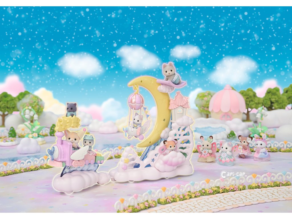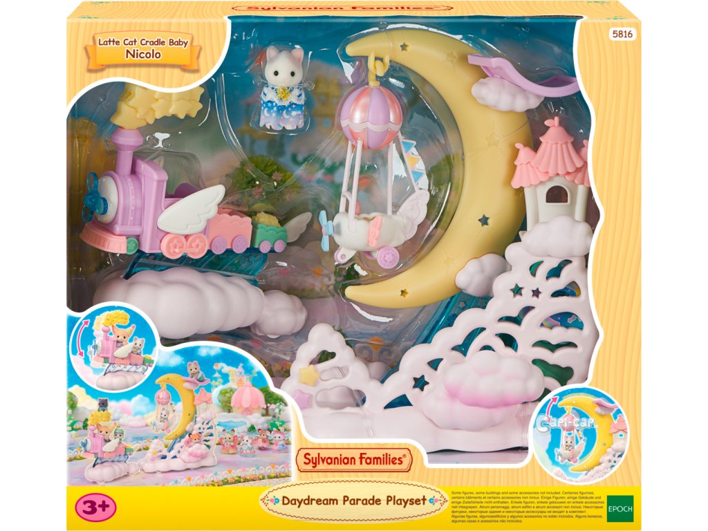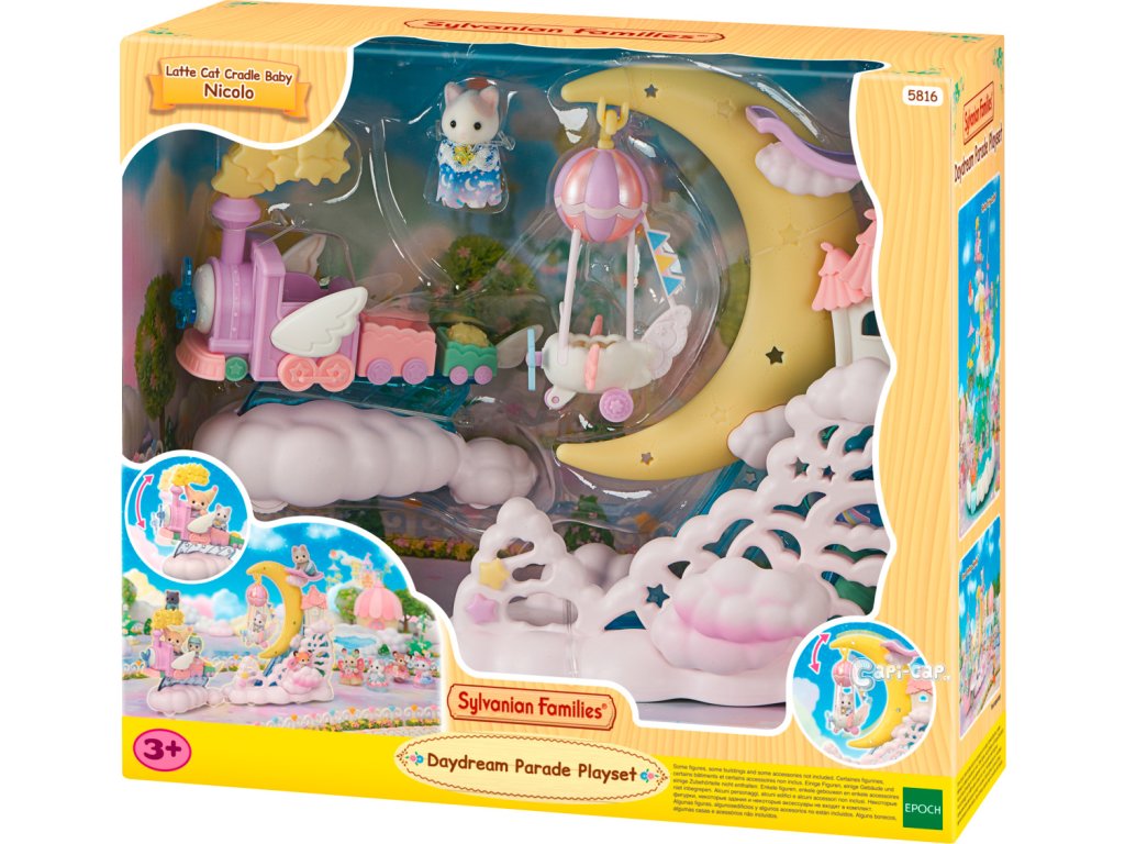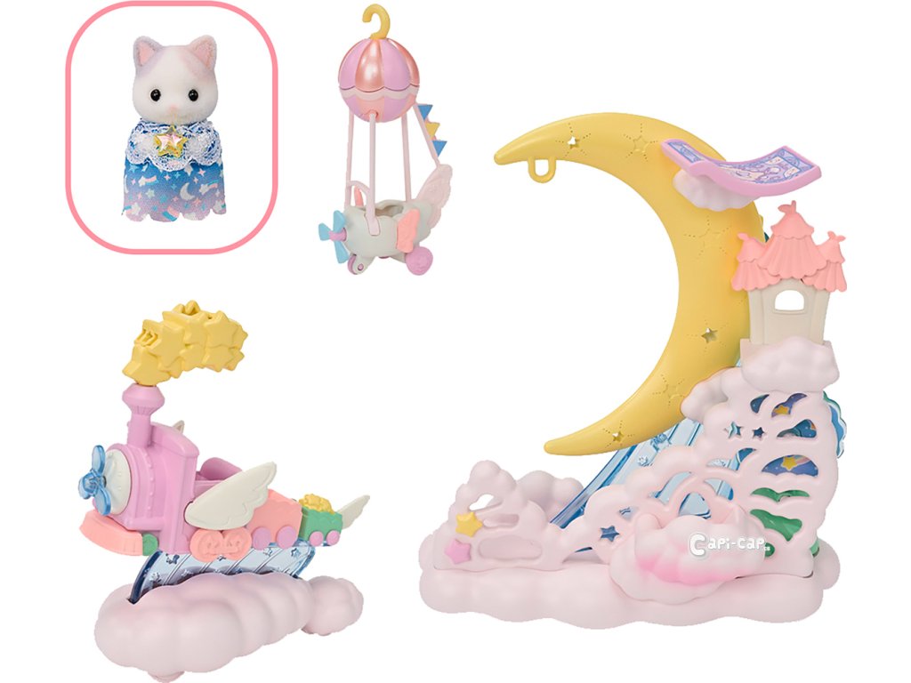 Průvod v oblacích právě začíná. Kouzelný vůz ve tvaru létající lokomotivy táhne za sebou plošinu s obrovským měsícem. V sadě je roztomilá figurka miminka z rodiny Latte kočiček. Malý Nicolo v kostýmu padající hvězdy sedí pohodlně v balónkovém letadélku, které se houpá připevněné k měsíci. Během jízdy se měsíc jemně houpe, což rozkmitá balónkové letadélko. Všechny prvky sady průvodu v oblacích lze spojit nebo si s nimi hrát samostatně. Hračky Sylvanian Families rozvíjejí představivost a podporují děti v hraní rolí. Hra s figurkami rozvíjí kreativitu a učí emocím vytvářením a vyprávěním příběhů založených na každodenních zážitcích a pozorování světa. Vyznačují se nejvyšší kvalitou a výjimečným důrazem na detaily. Figurky Sylvanian Families jsou pokryté měkkým semišem a mají pohyblivé končetiny a hlavu. Baleno v krabičce. Rozměry balení: 23 x 26 x 10 cm. Věk: 3+