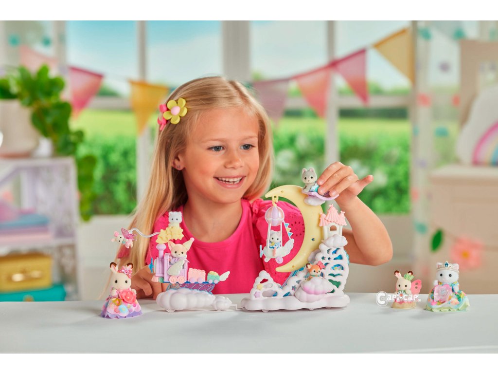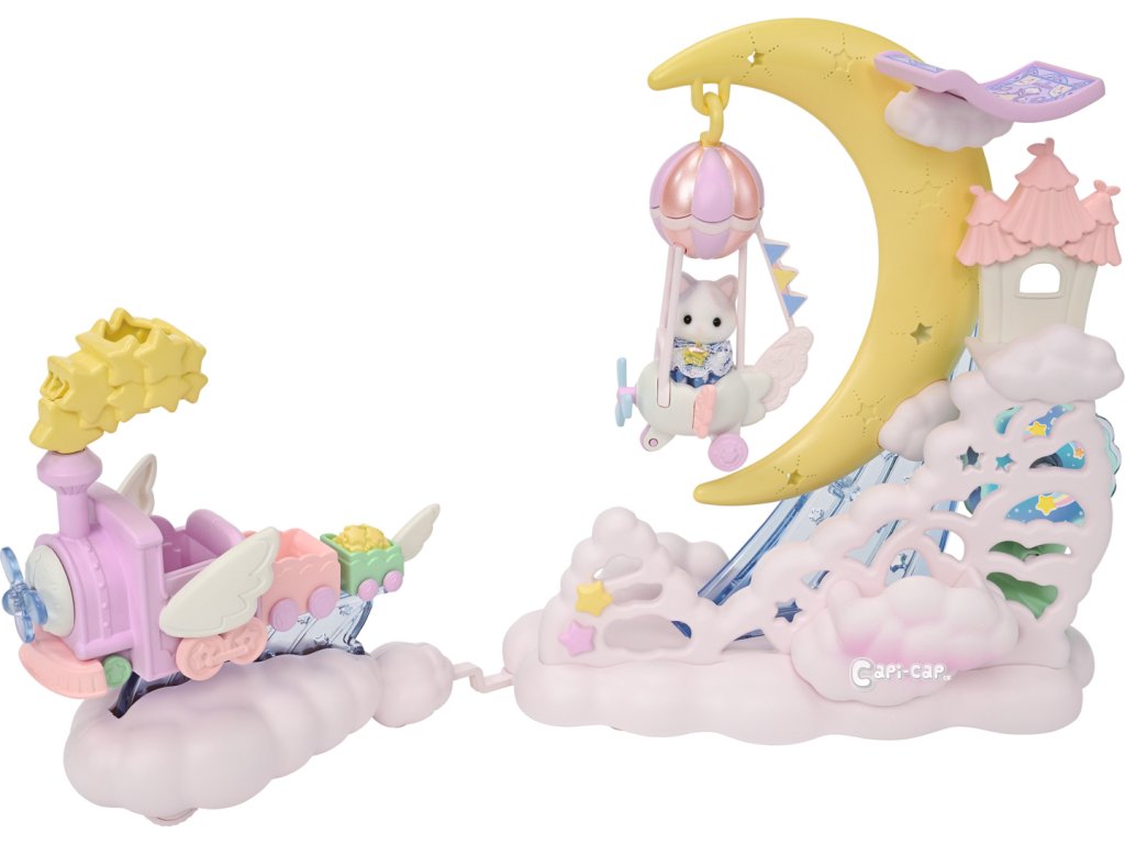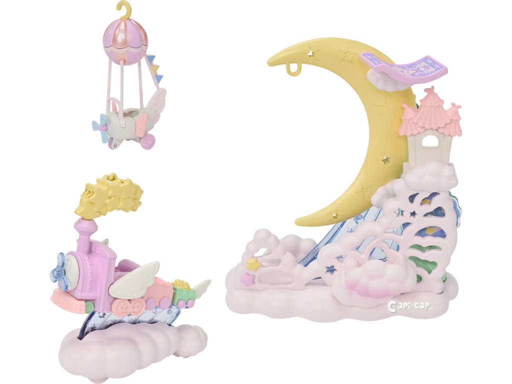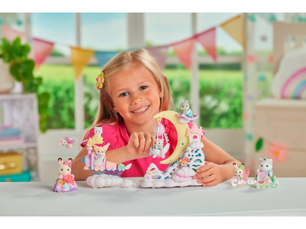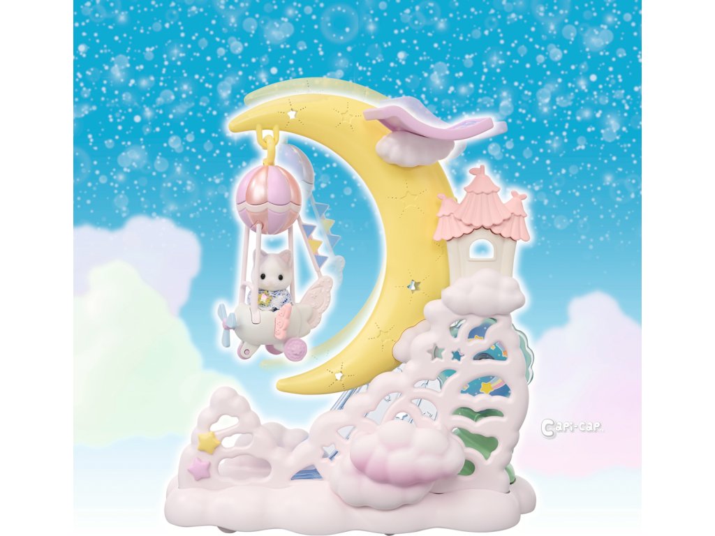 Průvod v oblacích právě začíná. Kouzelný vůz ve tvaru létající lokomotivy táhne za sebou plošinu s obrovským měsícem. V sadě je roztomilá figurka miminka z rodiny Latte kočiček. Malý Nicolo v kostýmu padající hvězdy sedí pohodlně v balónkovém letadélku, které se houpá připevněné k měsíci. Během jízdy se měsíc jemně houpe, což rozkmitá balónkové letadélko. Všechny prvky sady průvodu v oblacích lze spojit nebo si s nimi hrát samostatně. Hračky Sylvanian Families rozvíjejí představivost a podporují děti v hraní rolí. Hra s figurkami rozvíjí kreativitu a učí emocím vytvářením a vyprávěním příběhů založených na každodenních zážitcích a pozorování světa. Vyznačují se nejvyšší kvalitou a výjimečným důrazem na detaily. Figurky Sylvanian Families jsou pokryté měkkým semišem a mají pohyblivé končetiny a hlavu. Baleno v krabičce. Rozměry balení: 23 x 26 x 10 cm. Věk: 3+