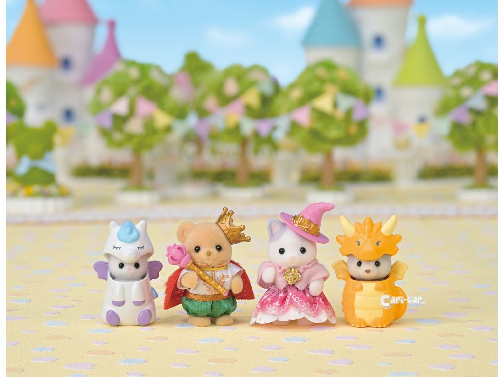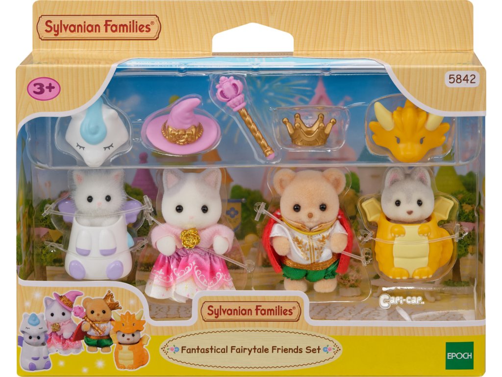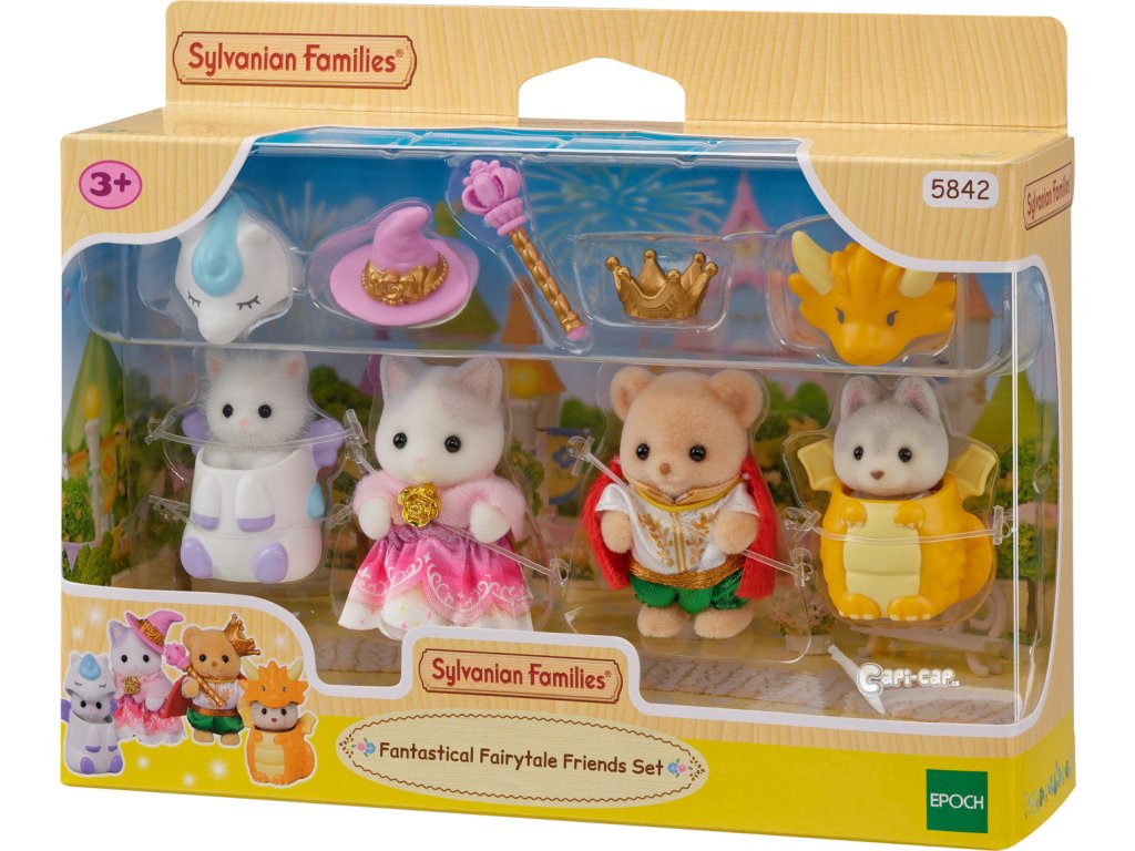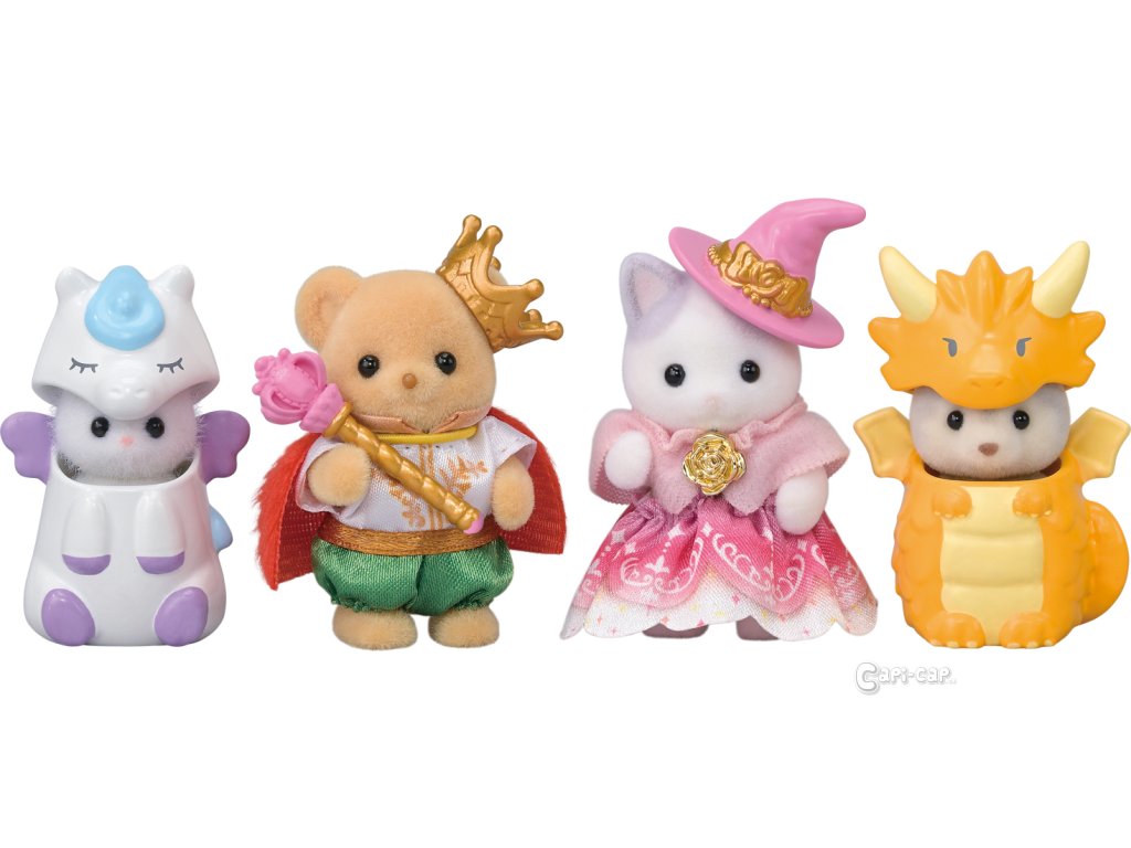 Seznamte se se čtveřicí přátel ze světa Sylvanian Families, převlečených do pohádkových kostýmů. Krásné a jedinečné kostýmy byly navrženy k oslavě 40. výročí Sylvanian Families! Malá Blair z rodiny perských koček se převlékla za bájného Pegase, Mabel z rodiny Latte koček má čarodějnický kostým, Noah holčička z rodiny sušenkových medvídků, si oblékla šaty pro prince a Drake z rodiny husky se hrdě představuje v dračím kostýmu. Hračky Sylvanian Families rozvíjejí představivost a povzbuzují děti k hraní rolí. Hra s figurkami rozvíjí kreativitu a učí emocím vytvářením a vyprávěním příběhů založených na každodenních zážitcích a pozorování světa. Vyznačují se nejvyšší kvalitou a výjimečným důrazem na detaily. Figurky Sylvanian Families jsou pokryté měkkým semišem, mají pohyblivé končetiny a hlavu. Oblečení lze z figurek sundat a vyměnit za jiný outfit. Baleno v krabičce. Rozměry balení: 13 x 16,5 x 4,5 cm. Věk: 3+