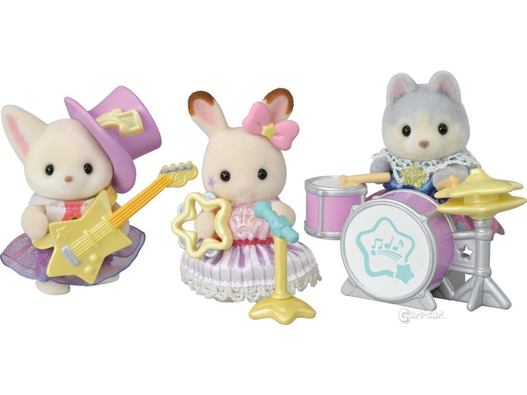 Oslavte 40. výročí Sylvanian Families s exkluzivní edicí figurek. Sada obsahuje tři miminka – baby čokoládového králíka, baby fenka a baby huskyho – oblečená v kostýmech s hvězdnou tematikou a s nástroji jako buben, kytara a tamburína. Jejich koncertní vystoupení jistě oživí publikum. Hračky Sylvanian Families rozvíjejí představivost a povzbuzují děti k hraní rolí. Hra s figurkami rozvíjí kreativitu a učí emocím vytvářením a vyprávěním příběhů založených na každodenních zážitcích a pozorování světa. Vyznačují se nejvyšší kvalitou a výjimečným důrazem na detaily. Figurky Sylvanian Families jsou pokryté měkkým semišem, mají pohyblivé končetiny a hlavu. Oblečení lze z figurek sundat a vyměnit za jiný outfit. Baleno v krabičce. Rozměry balení: 13 x 16 x 5 cm. Věk: 3+