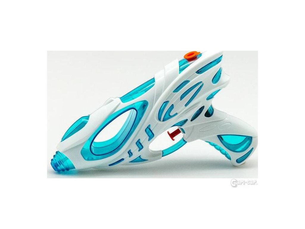 Vodná striekacia pištoľ s plnením zhora. Na prvý pohľad zaujme futuristický organický vzhľad – biela farba v kombinácii s priehľadnou modrou.