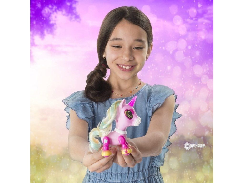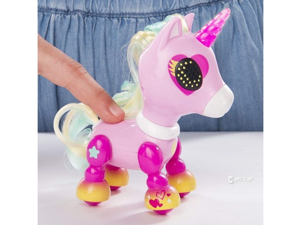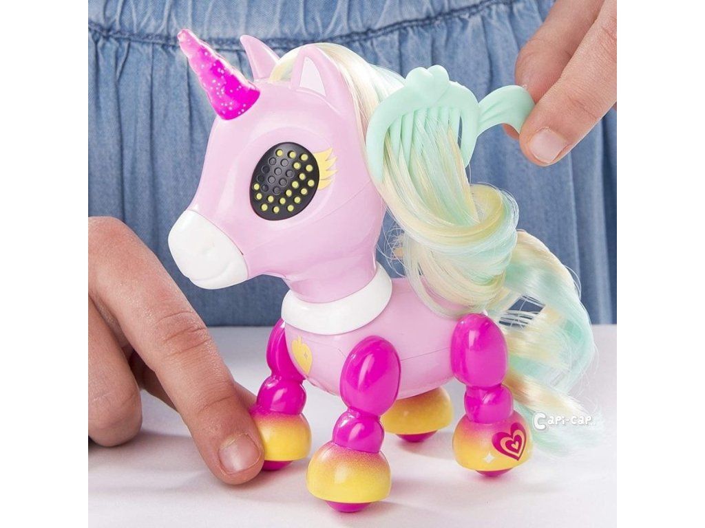 Interaktivní jednorožec reaguje na vaše doteky, vydává veselé zvuky a svítí mu oči a také umí svůj jedinečný trik. Navíc má krásnou dlouhou hřívu a ocas, které lze česat přiloženým hřebenem.